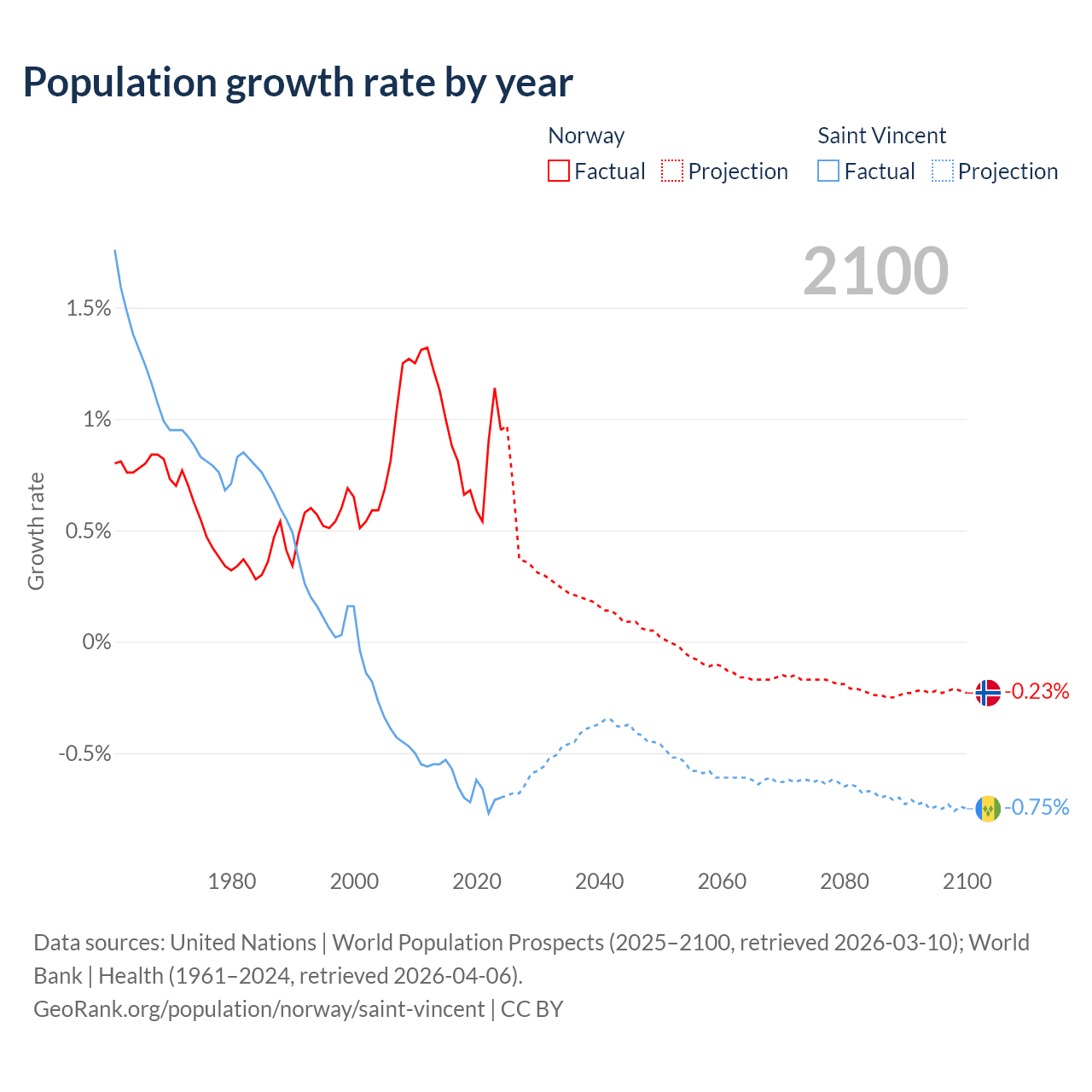 - For the last 10 years, Norway has had an average growth rate of +0.85% per year vs -0.65% in Saint Vincent.