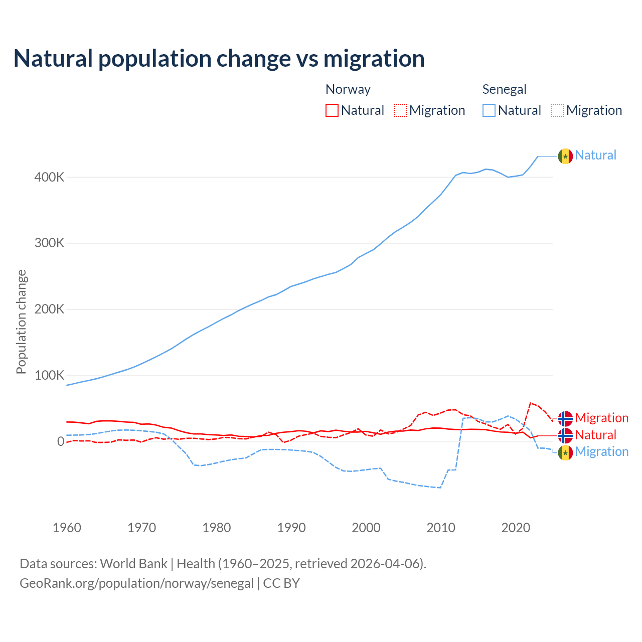 Over the last 10 years, 31.3% of the population change in Norway is from natural causes (a gain of 138,699 people) and 68.7% is from migration (a gain of 303,945 people). In Senegal 93.9% is from natural causes (a gain of 4,089,205 people) and 6.13% is from migration (a gain of 267,266 people).