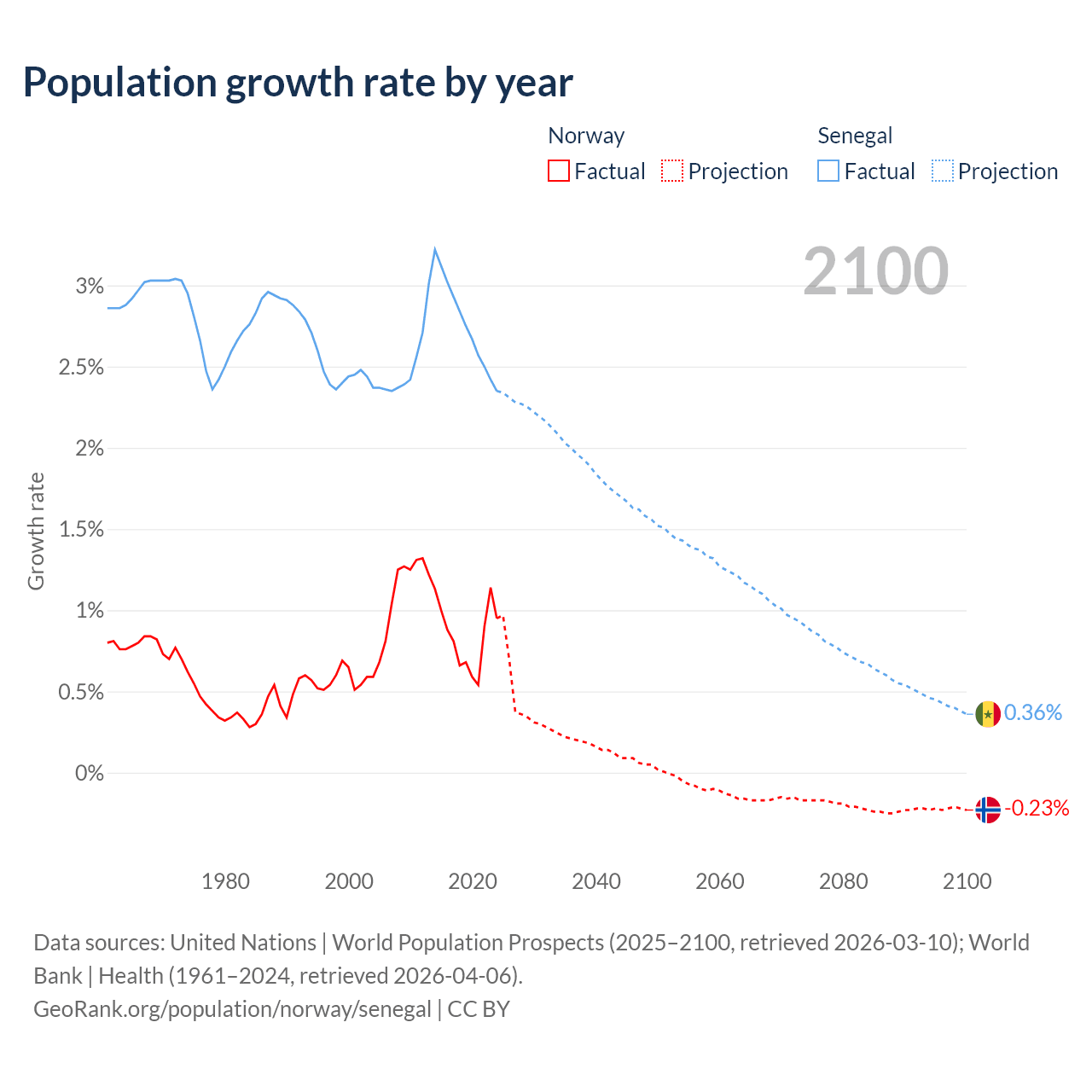 - For the last 10 years, Norway has had an average growth rate of +0.85% per year vs +2.76% in Senegal.