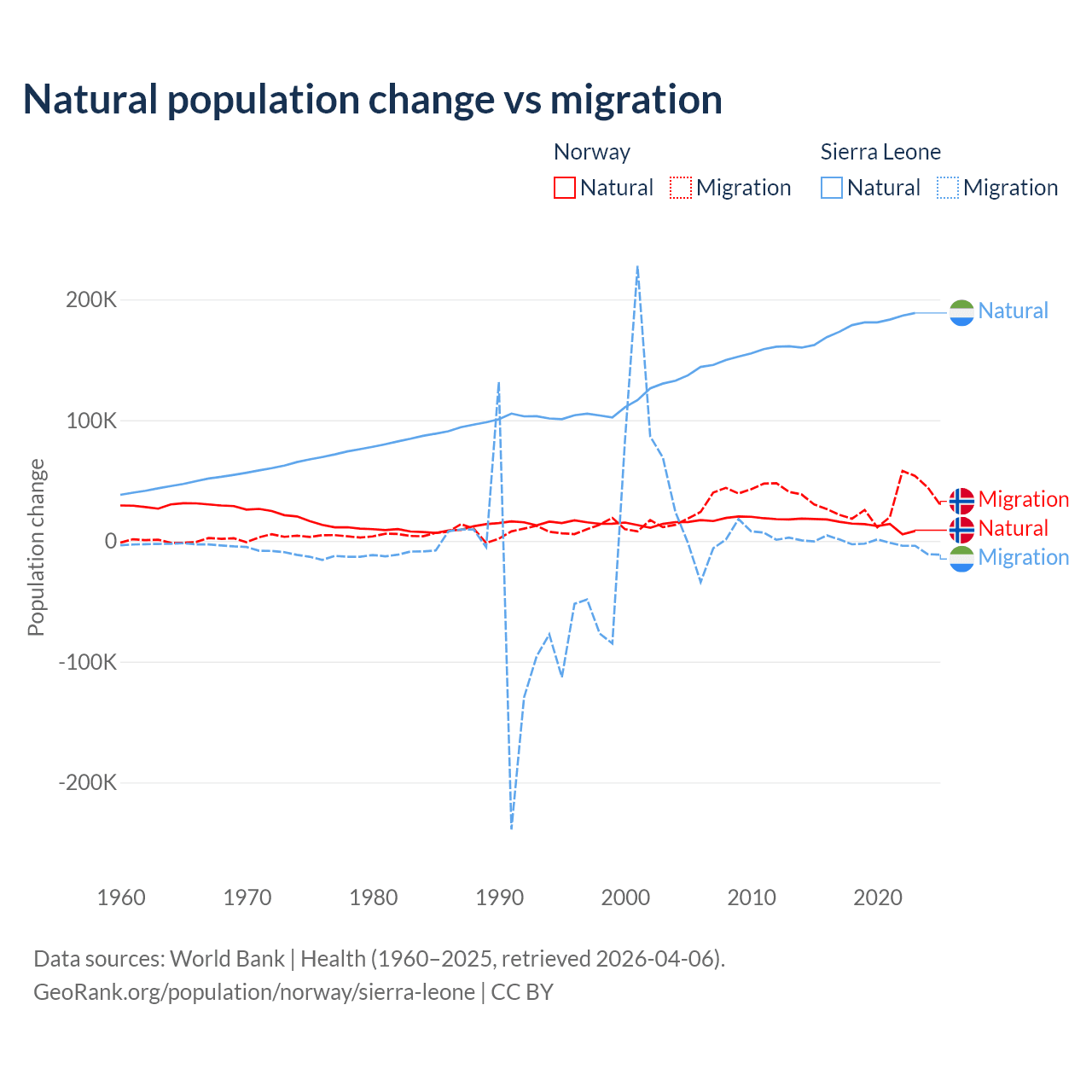 Over the last 10 years, 31.3% of the population change in Norway is from natural causes (a gain of 138,699 people) and 68.7% is from migration (a gain of 303,945 people). In Sierra Leone 99.6% is from natural causes (a gain of 1,764,049 people) and 0.41% is from migration (a loss of 7,211 people).