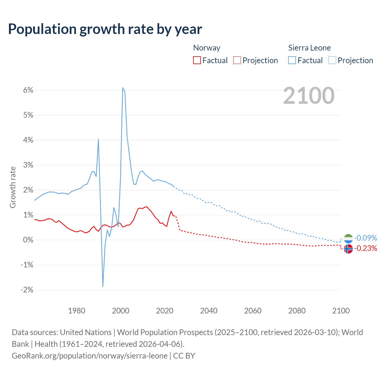- For the last 10 years, Norway has had an average growth rate of +0.85% per year vs +2.32% in Sierra Leone.