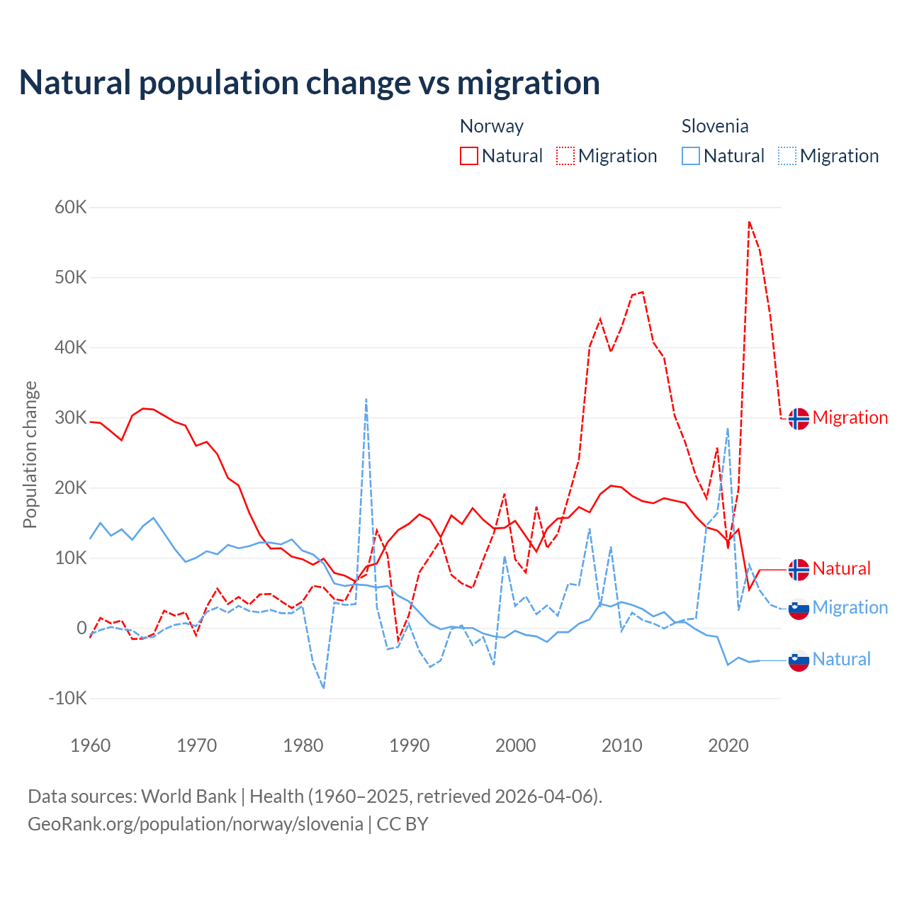 Over the last 10 years, 31.3% of the population change in Norway is from natural causes (a gain of 138,699 people) and 68.7% is from migration (a gain of 303,945 people). In Slovenia 18.1% is from natural causes (a loss of 17,573 people) and 81.9% is from migration (a gain of 79,532 people).