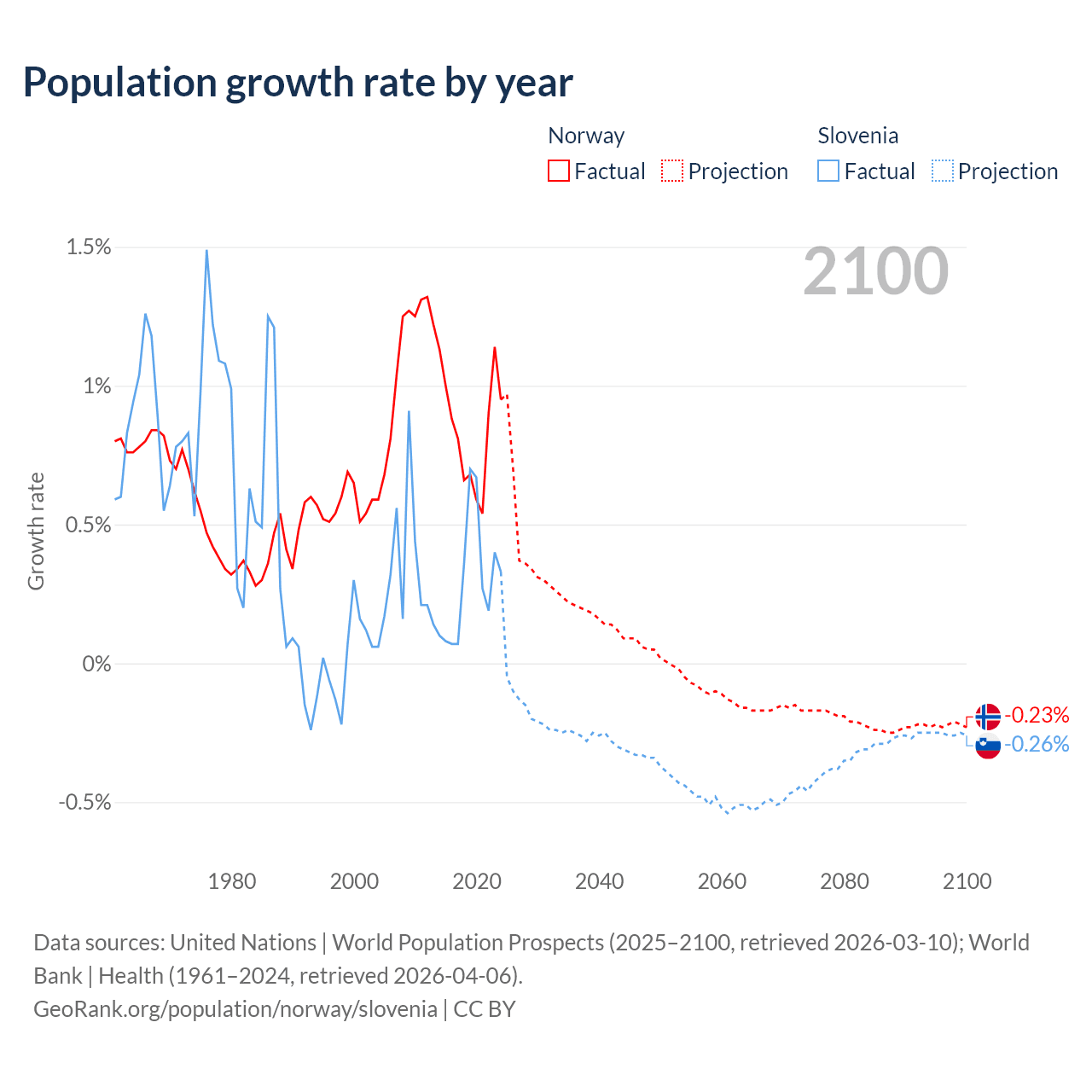 - For the last 10 years, Norway has had an average growth rate of +0.85% per year vs +0.29% in Slovenia.