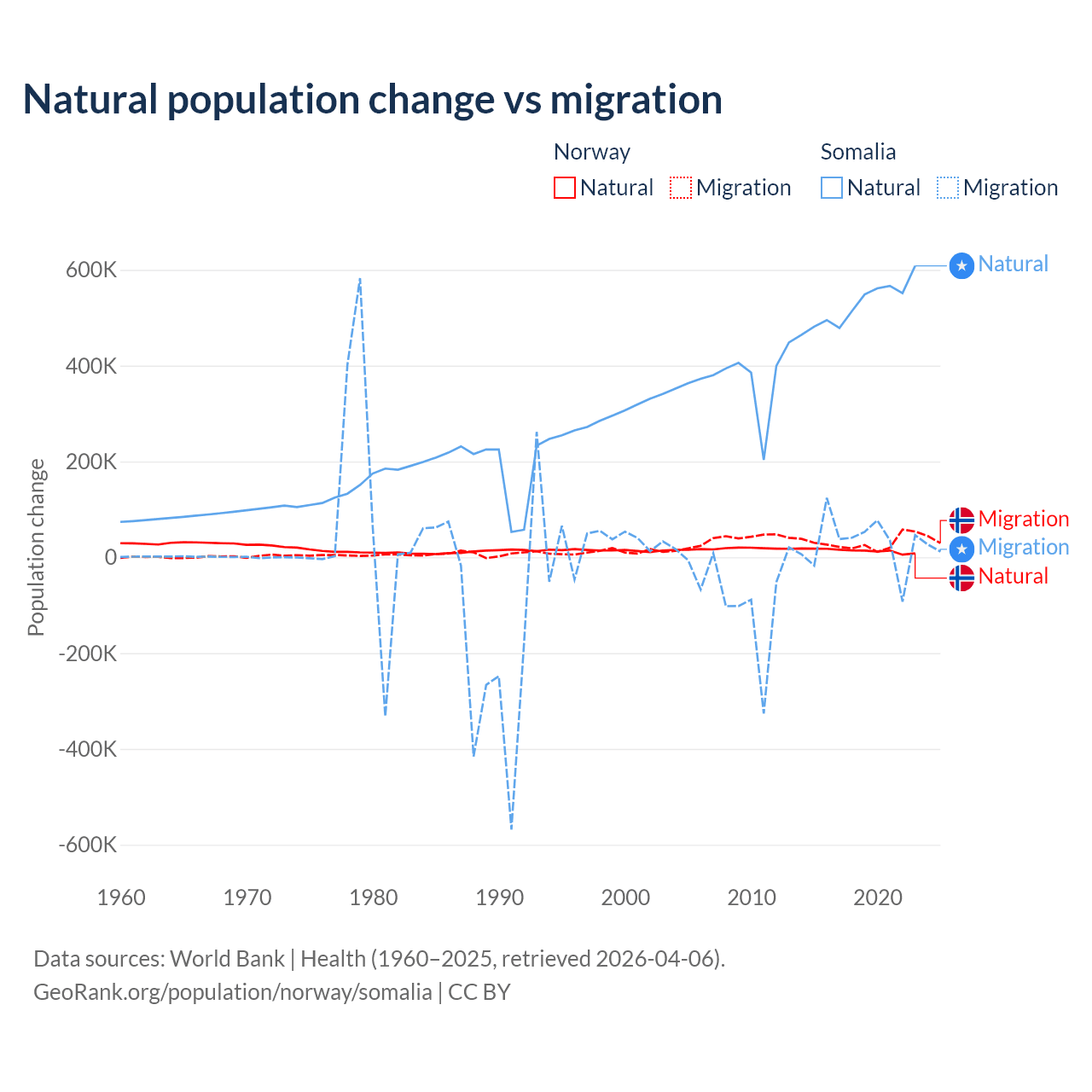 Over the last 10 years, 31.3% of the population change in Norway is from natural causes (a gain of 138,699 people) and 68.7% is from migration (a gain of 303,945 people). In Somalia 94.4% is from natural causes (a gain of 5,270,105 people) and 5.58% is from migration (a gain of 311,487 people).