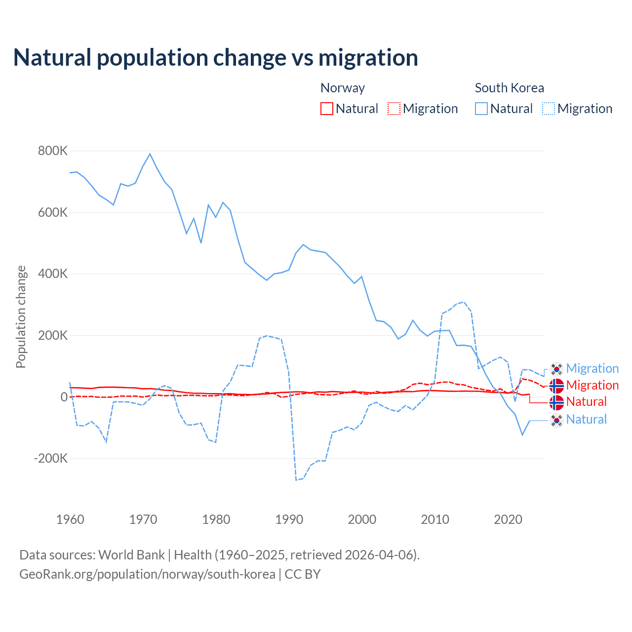 Over the last 10 years, 31.3% of the population change in Norway is from natural causes (a gain of 138,699 people) and 68.7% is from migration (a gain of 303,945 people). In South Korea 17.6% is from natural causes (a gain of 277,215 people) and 82.4% is from migration (a gain of 1,298,356 people).