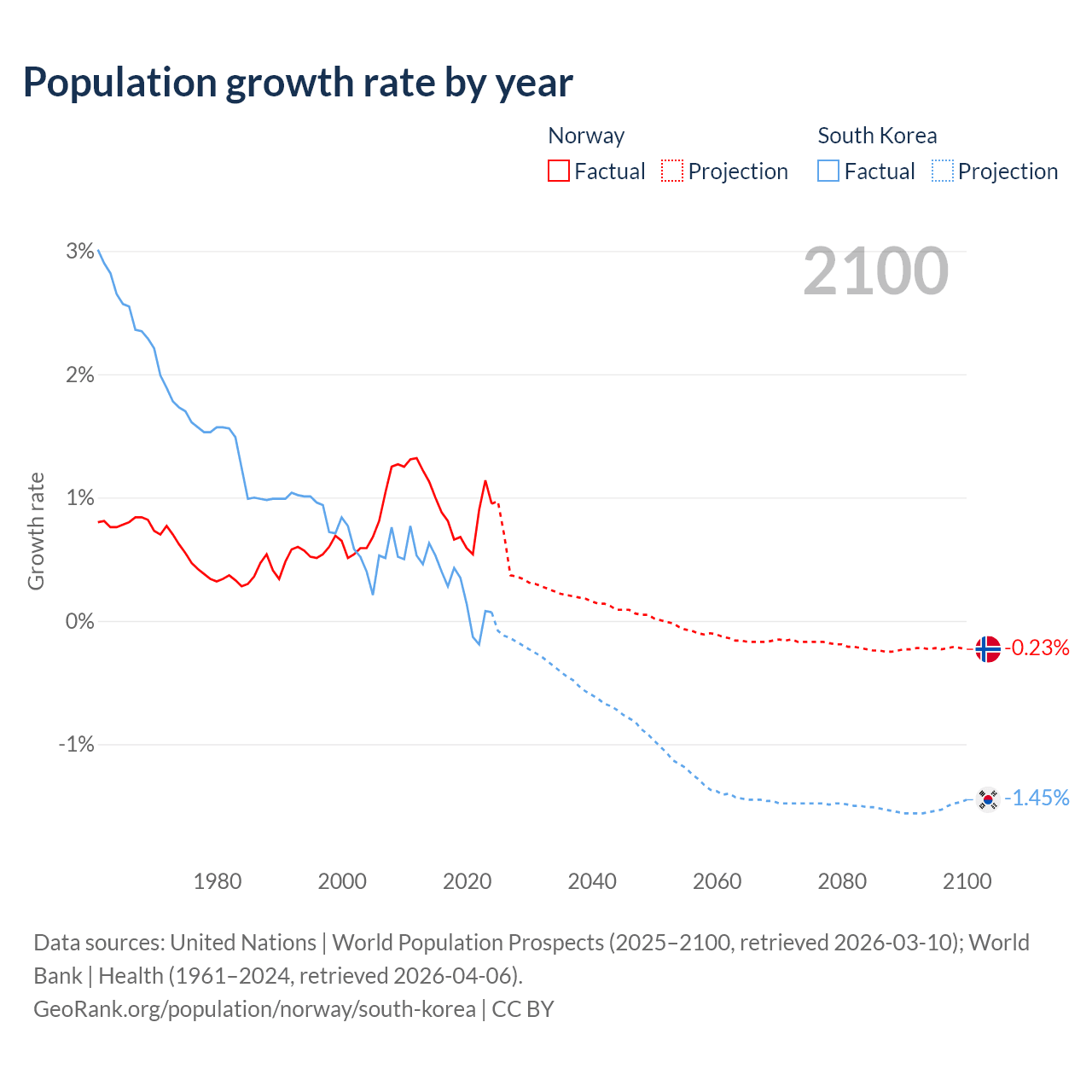 - For the last 10 years, Norway has had an average growth rate of +0.85% per year vs +0.24% in South Korea.