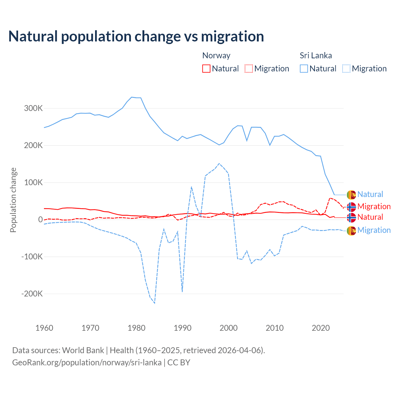 Over the last 10 years, 31.3% of the population change in Norway is from natural causes (a gain of 138,699 people) and 68.7% is from migration (a gain of 303,945 people). In Sri Lanka 85.3% is from natural causes (a gain of 1,605,749 people) and 14.7% is from migration (a loss of 276,121 people).