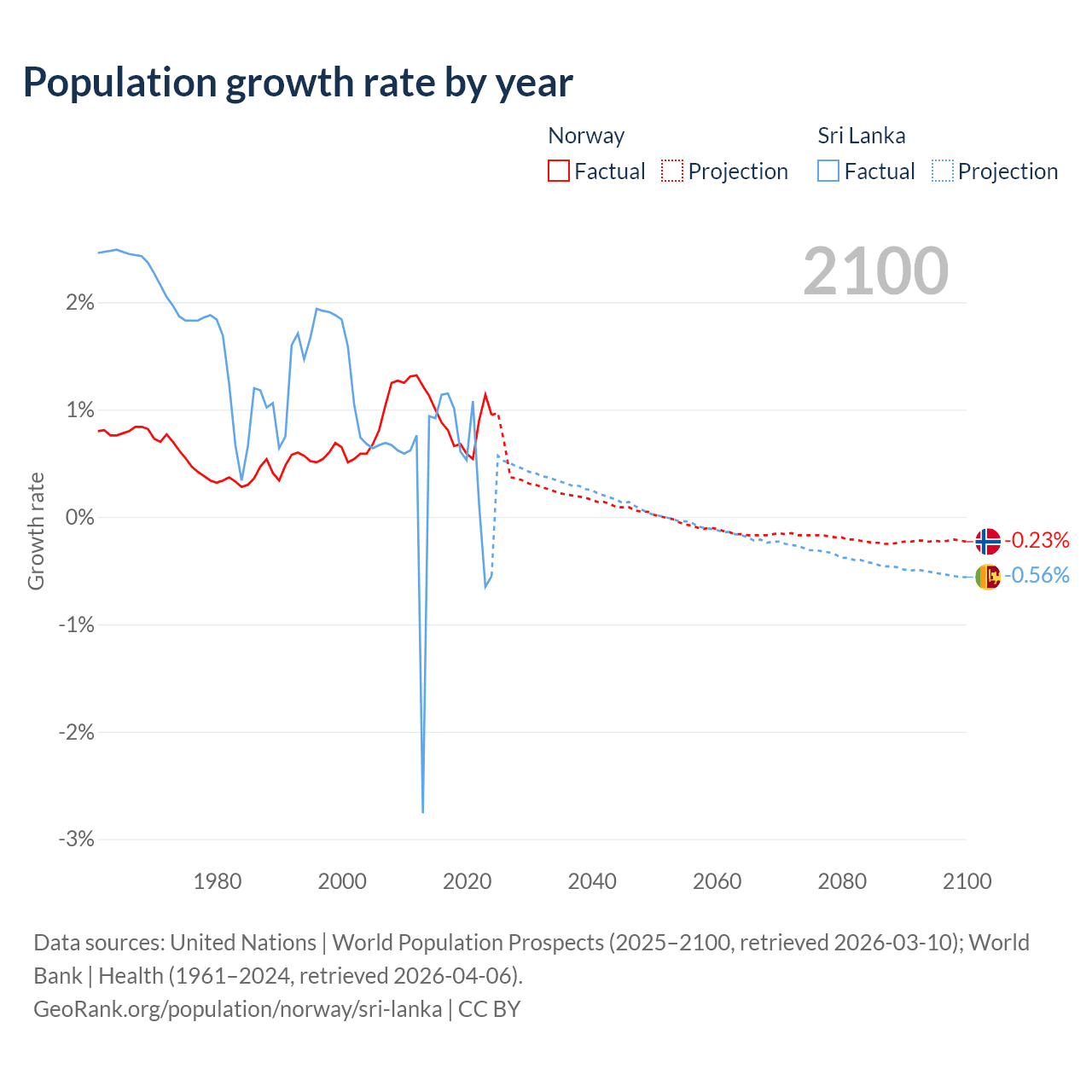 - For the last 10 years, Norway has had an average growth rate of +0.85% per year vs +0.57% in Sri Lanka.