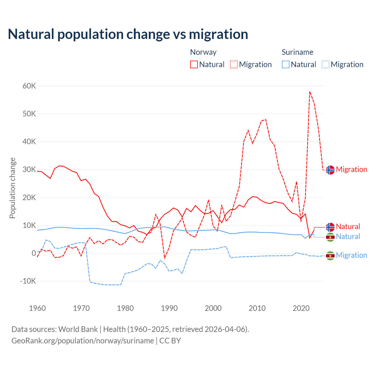 Over the last 10 years, 31.3% of the population change in Norway is from natural causes (a gain of 138,699 people) and 68.7% is from migration (a gain of 303,945 people). In Suriname 90.3% is from natural causes (a gain of 66,709 people) and 9.72% is from migration (a loss of 7,185 people).