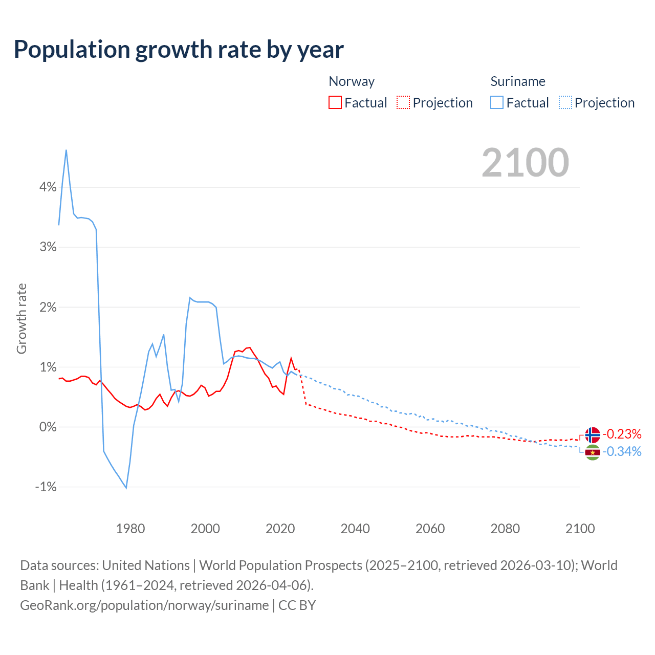 - For the last 10 years, Norway has had an average growth rate of +0.85% per year vs +0.99% in Suriname.
