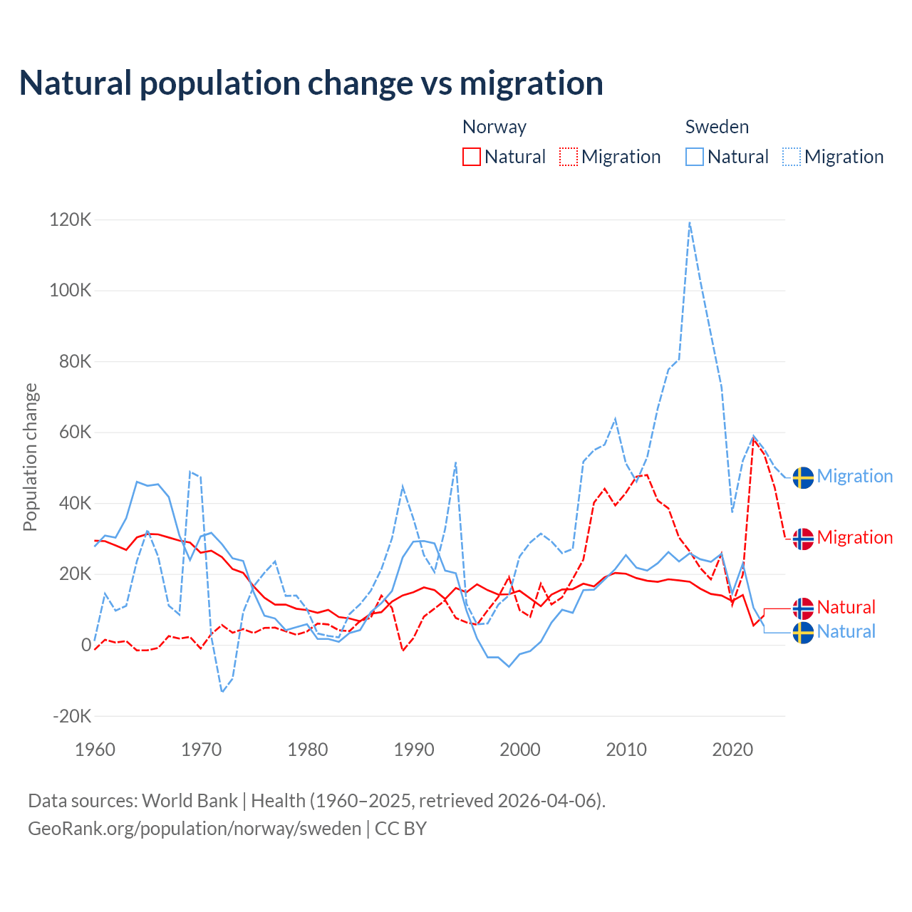 Over the last 10 years, 31.3% of the population change in Norway is from natural causes (a gain of 138,699 people) and 68.7% is from migration (a gain of 303,945 people). In Sweden 21.4% is from natural causes (a gain of 201,900 people) and 78.6% is from migration (a gain of 743,642 people).