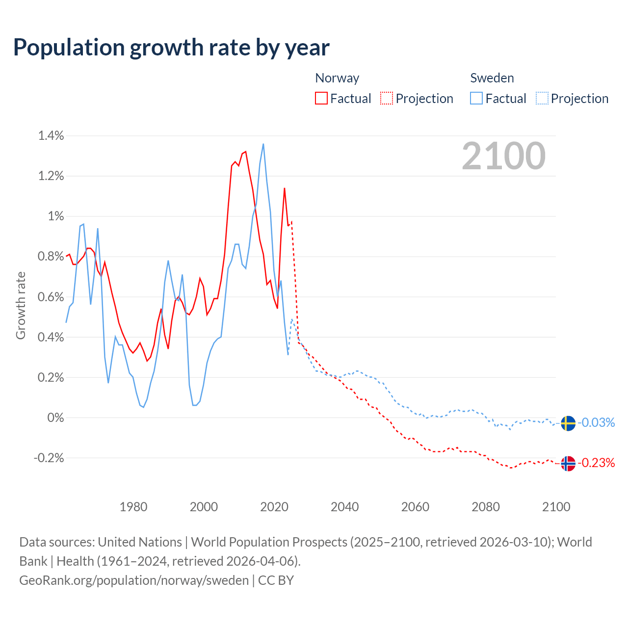 - For the last 10 years, Norway has had an average growth rate of +0.85% per year vs +0.88% in Sweden.