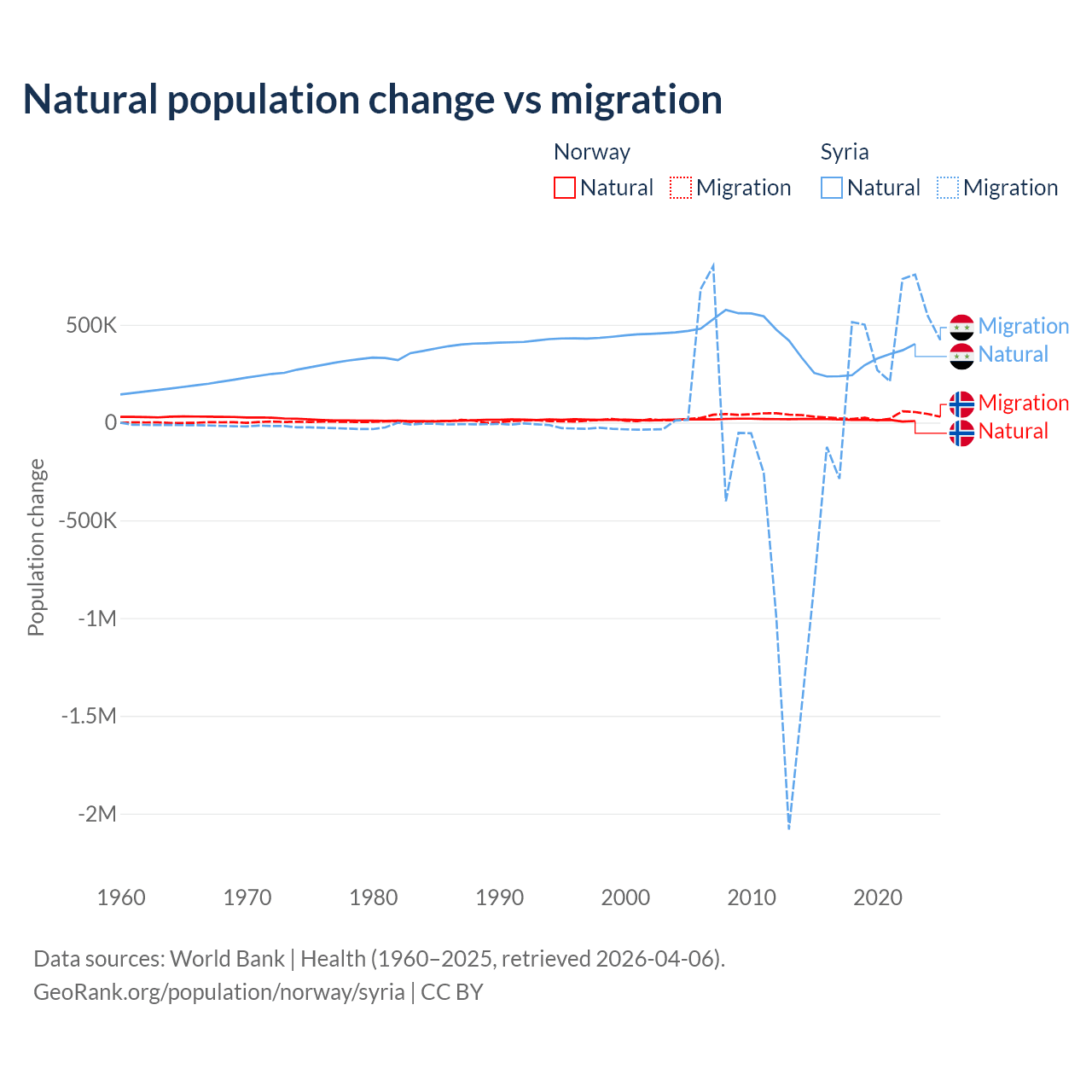 Over the last 10 years, 31.3% of the population change in Norway is from natural causes (a gain of 138,699 people) and 68.7% is from migration (a gain of 303,945 people). In Syria 91.3% is from natural causes (a gain of 3,047,621 people) and 8.72% is from migration (a gain of 291,069 people).