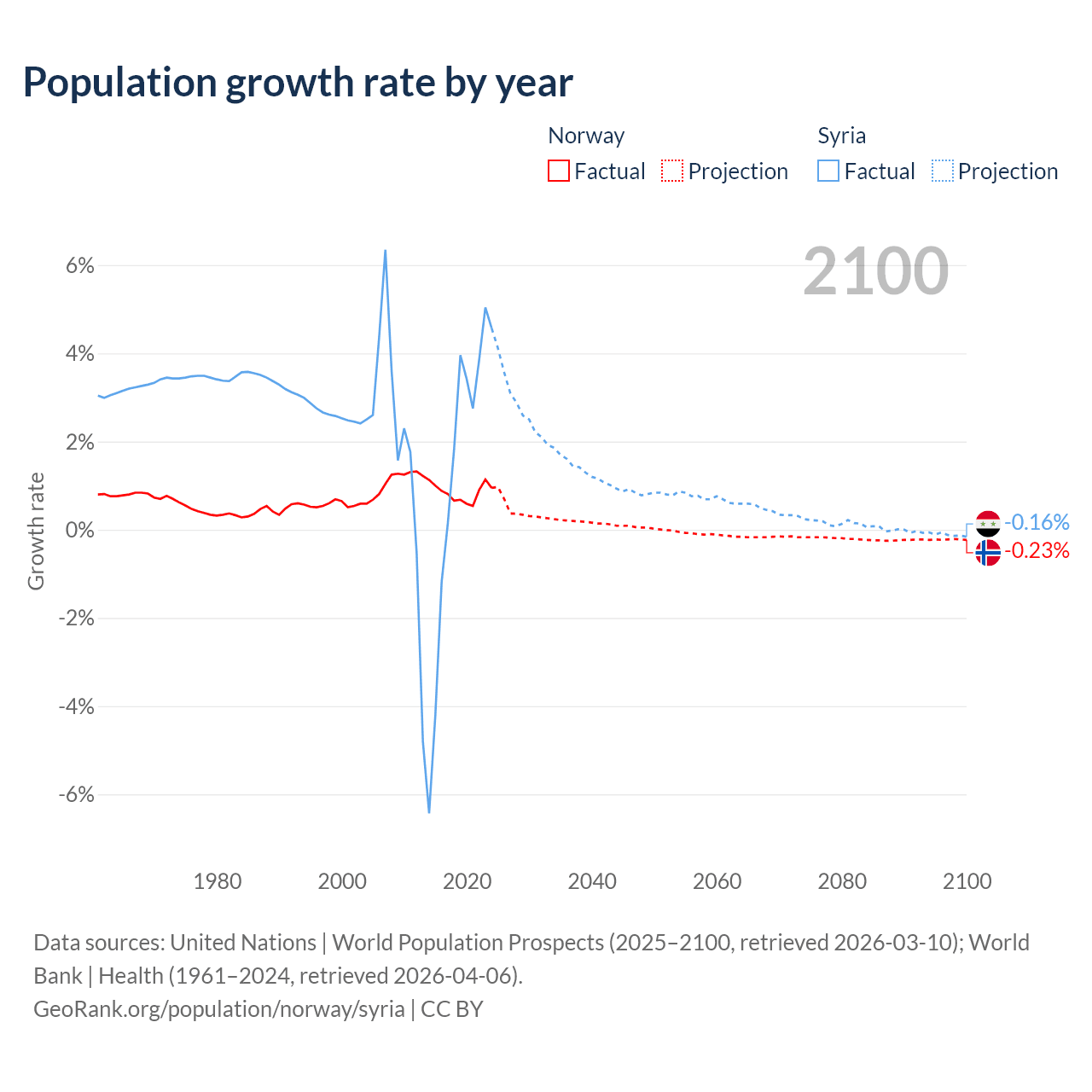 - For the last 10 years, Norway has had an average growth rate of +0.85% per year vs +1.25% in Syria.