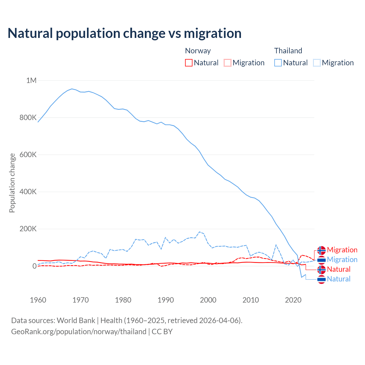 Over the last 10 years, 31.3% of the population change in Norway is from natural causes (a gain of 138,699 people) and 68.7% is from migration (a gain of 303,945 people). In Thailand 78.4% is from natural causes (a gain of 1,292,528 people) and 21.6% is from migration (a gain of 355,361 people).