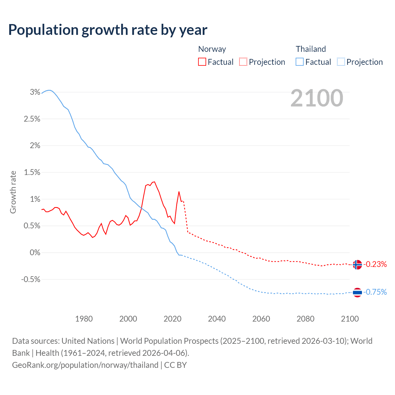 - For the last 10 years, Norway has had an average growth rate of +0.85% per year vs +0.23% in Thailand.