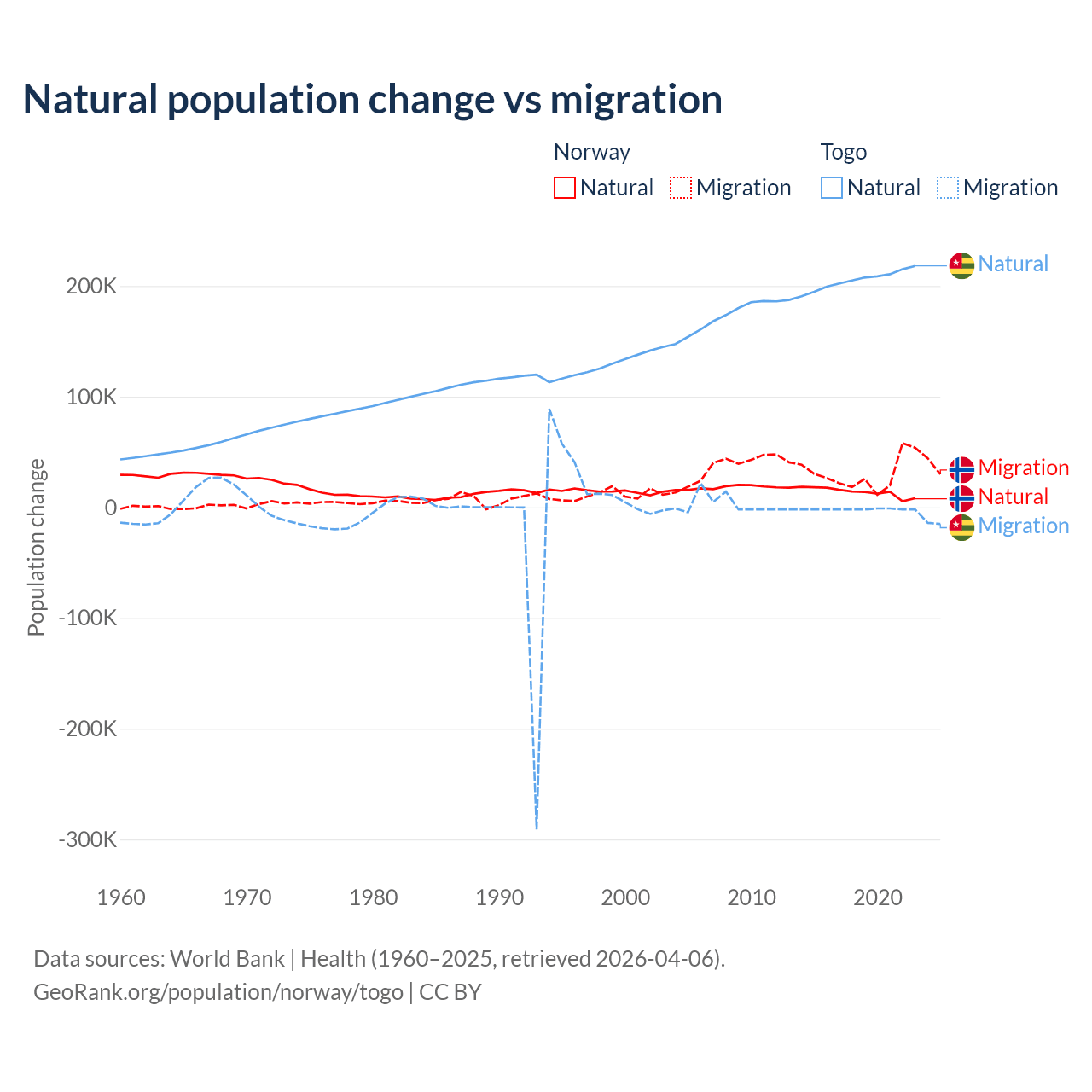 Over the last 10 years, 31.3% of the population change in Norway is from natural causes (a gain of 138,699 people) and 68.7% is from migration (a gain of 303,945 people). In Togo 99.1% is from natural causes (a gain of 2,052,115 people) and 0.86% is from migration (a loss of 17,852 people).