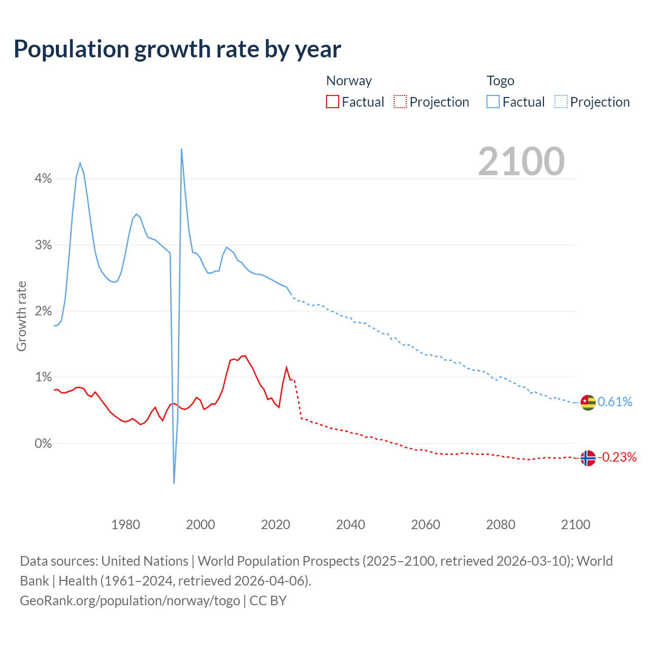 - For the last 10 years, Norway has had an average growth rate of +0.85% per year vs +2.46% in Togo.