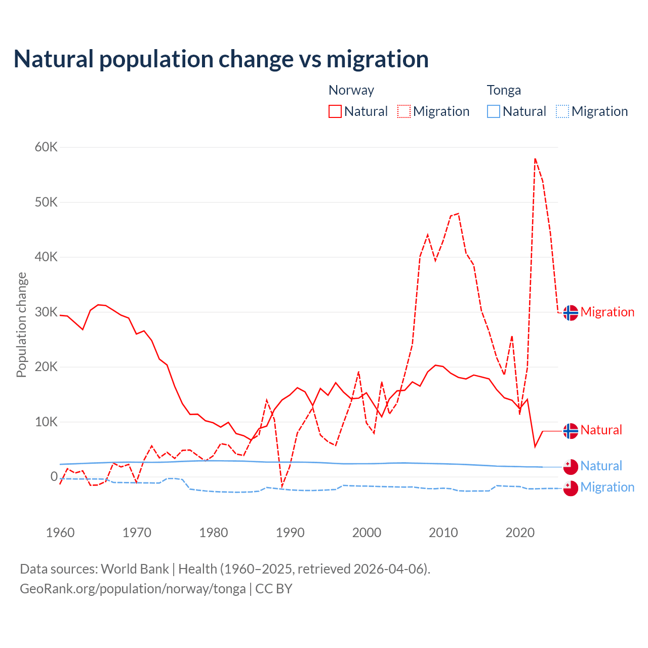 Over the last 10 years, 31.3% of the population change in Norway is from natural causes (a gain of 138,699 people) and 68.7% is from migration (a gain of 303,945 people). In Tonga 46.9% is from natural causes (a gain of 18,919 people) and 53.1% is from migration (a loss of 21,384 people).