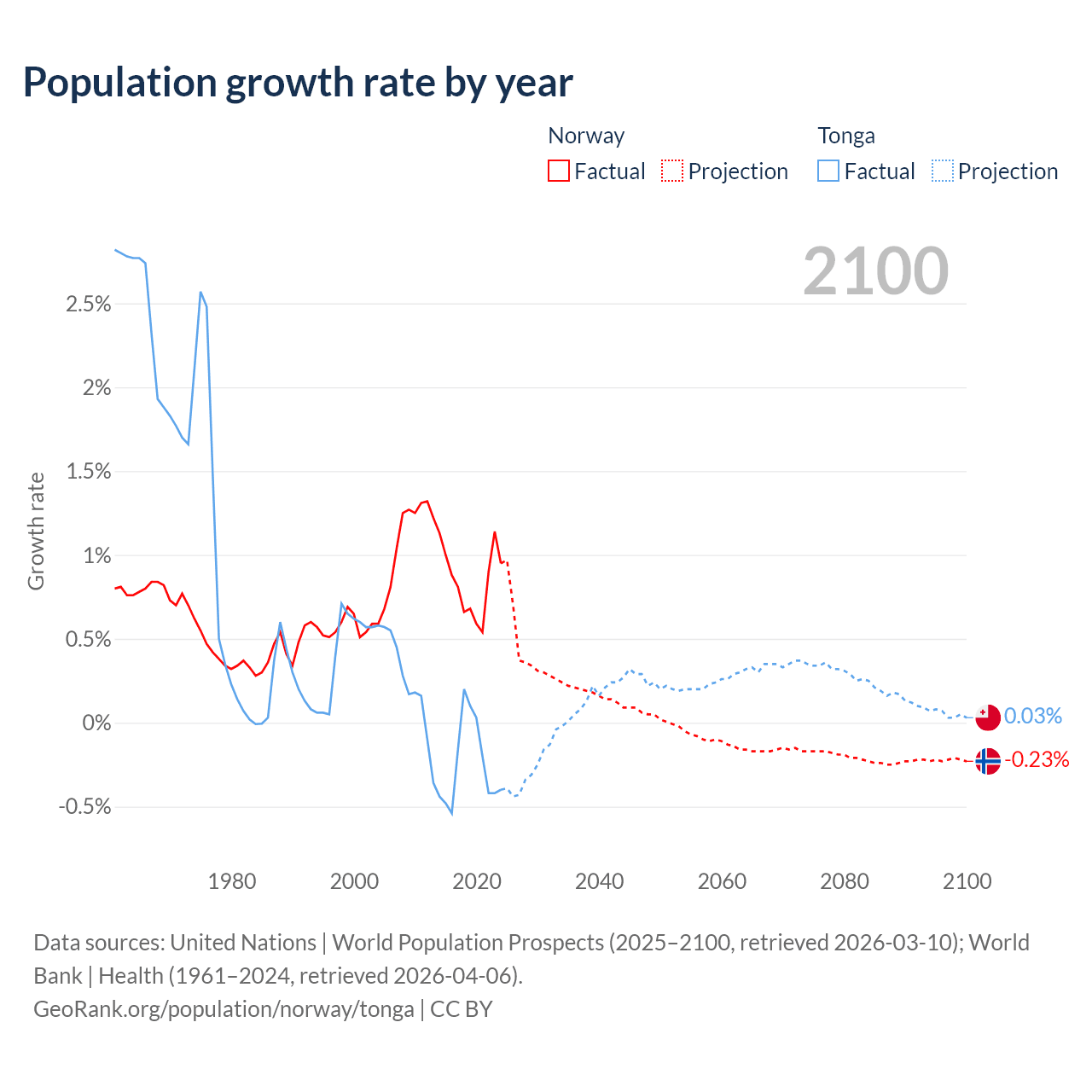 - For the last 10 years, Norway has had an average growth rate of +0.85% per year vs -0.25% in Tonga.