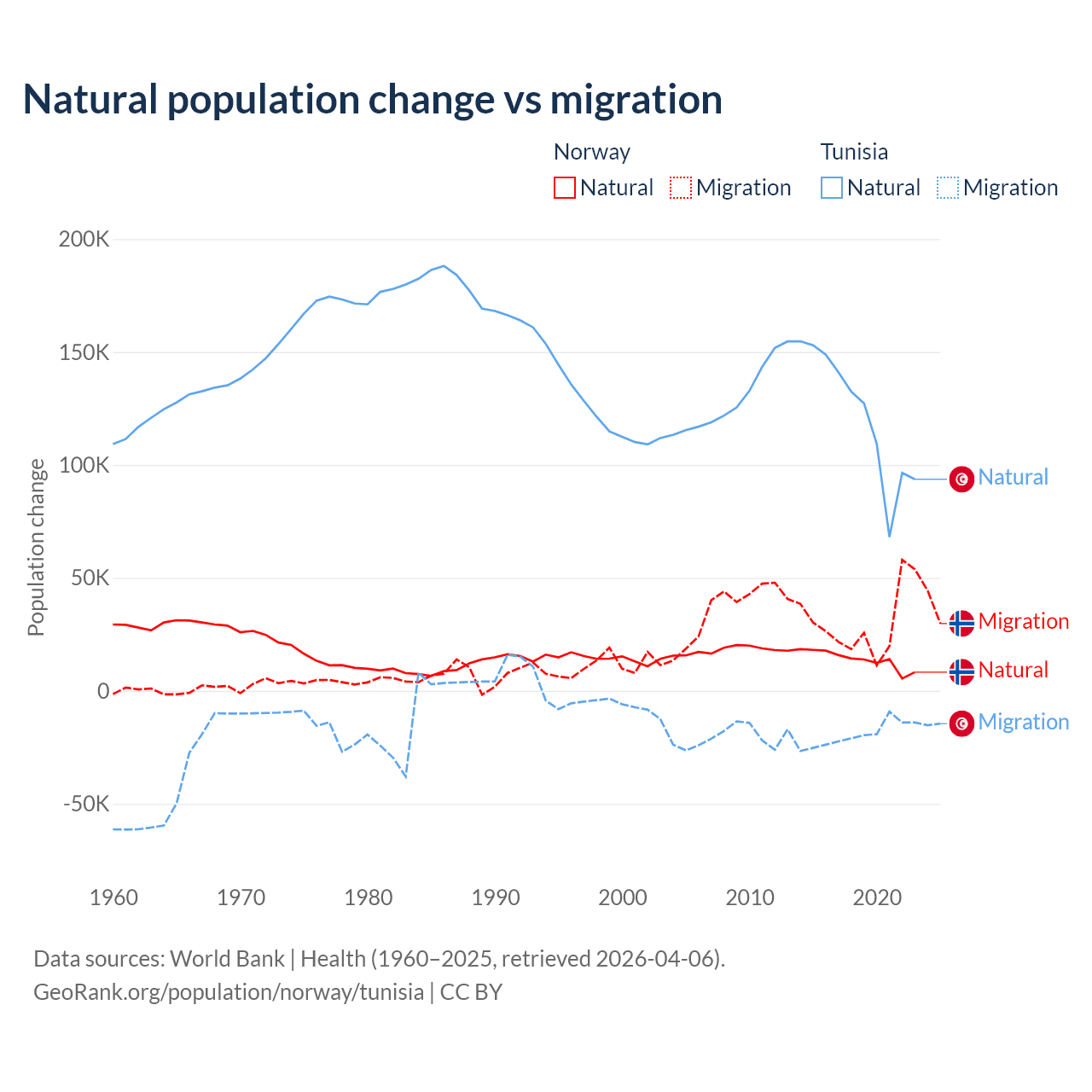 Over the last 10 years, 31.3% of the population change in Norway is from natural causes (a gain of 138,699 people) and 68.7% is from migration (a gain of 303,945 people). In Tunisia 86.3% is from natural causes (a gain of 1,225,079 people) and 13.7% is from migration (a loss of 195,011 people).