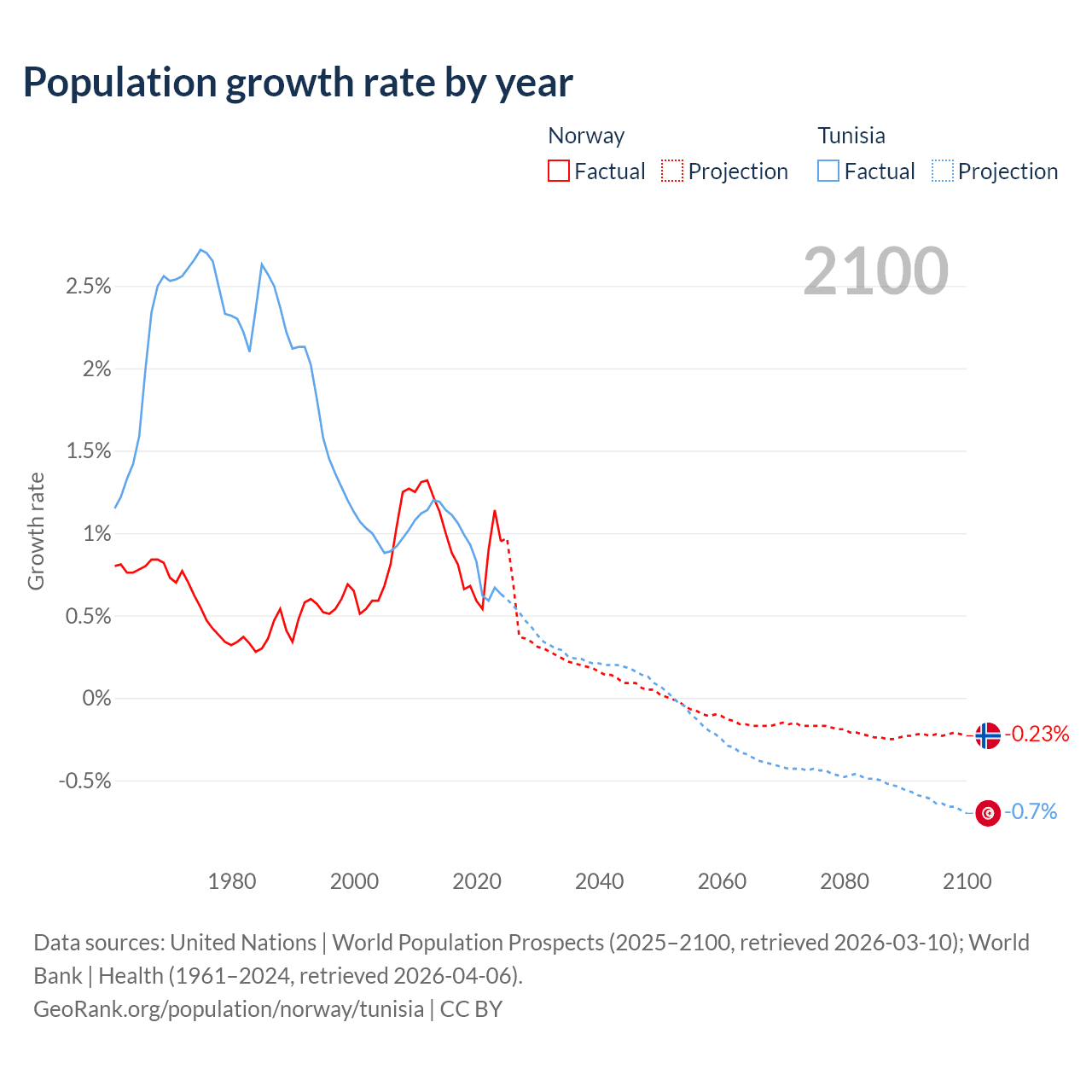 - For the last 10 years, Norway has had an average growth rate of +0.85% per year vs +0.89% in Tunisia.
