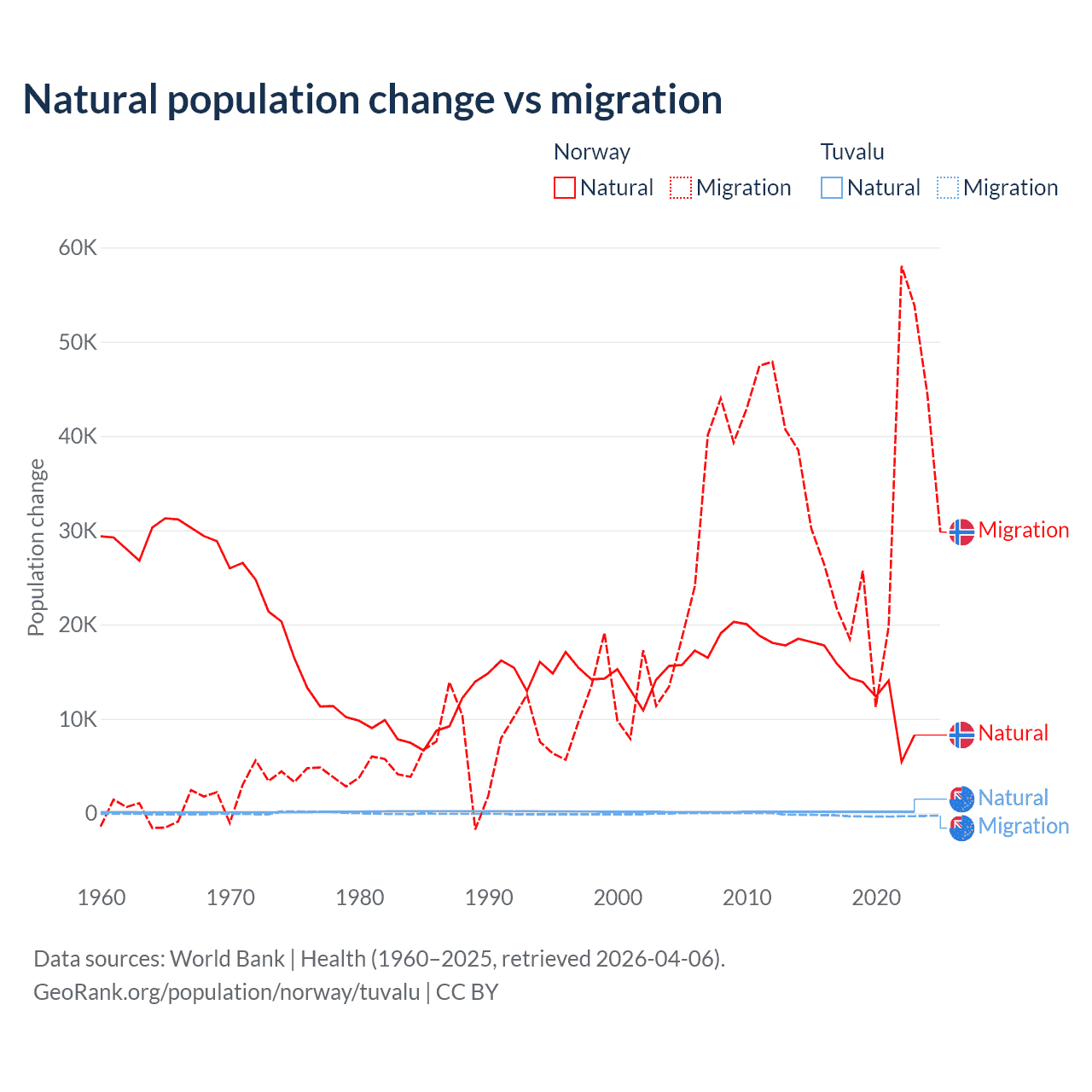 Over the last 10 years, 31.3% of the population change in Norway is from natural causes (a gain of 138,699 people) and 68.7% is from migration (a gain of 303,945 people). In Tuvalu 35.5% is from natural causes (a gain of 1,556 people) and 64.5% is from migration (a loss of 2,827 people).