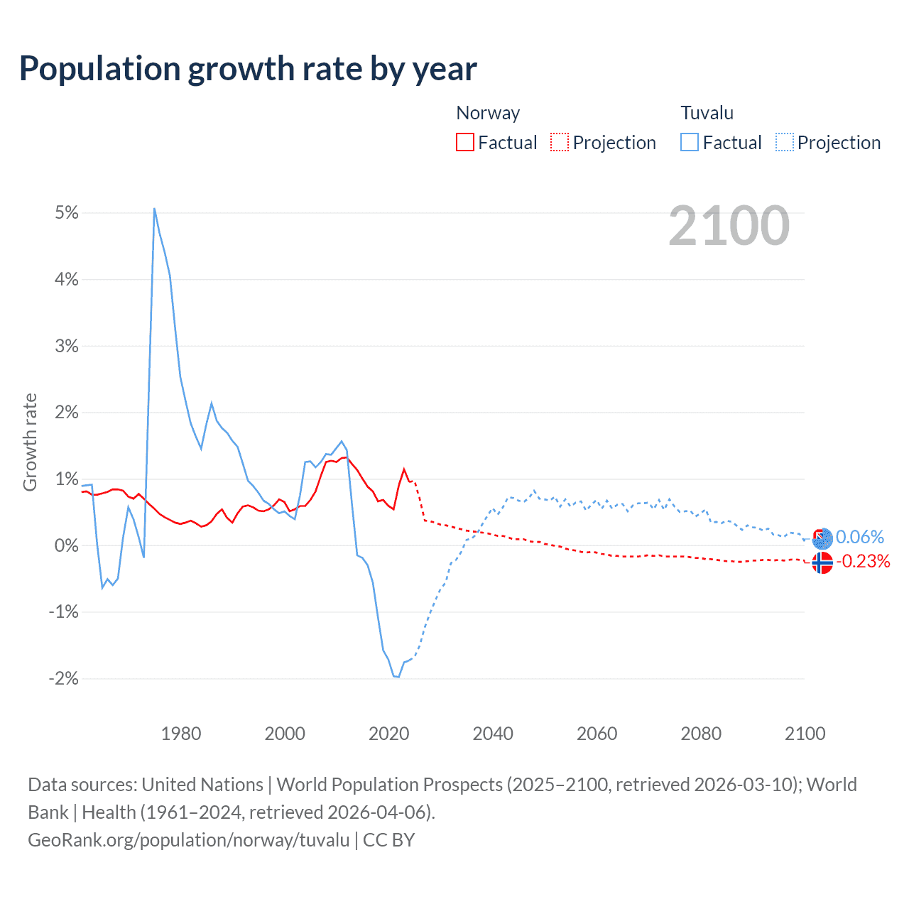 - For the last 10 years, Norway has had an average growth rate of +0.85% per year vs -1.19% in Tuvalu.