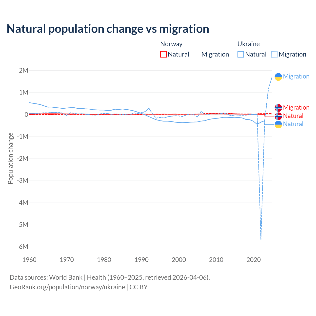 Over the last 10 years, 31.3% of the population change in Norway is from natural causes (a gain of 138,699 people) and 68.7% is from migration (a gain of 303,945 people). In Ukraine 28.2% is from natural causes (a loss of 2,435,153 people) and 71.8% is from migration (a loss of 6,198,995 people).