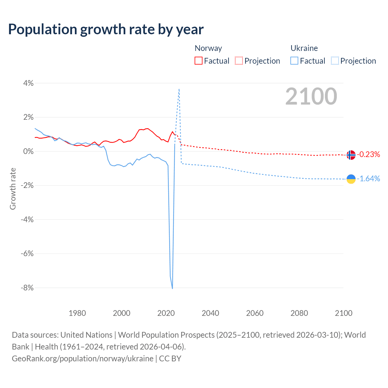 - For the last 10 years, Norway has had an average growth rate of +0.85% per year vs -1.74% in Ukraine.