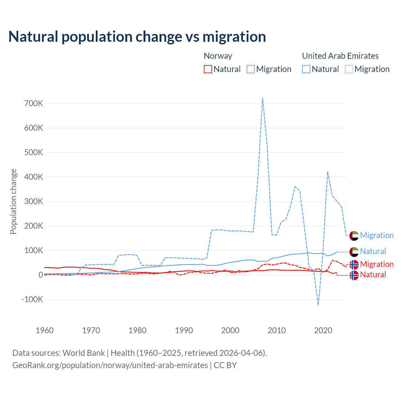 Over the last 10 years, 31.3% of the population change in Norway is from natural causes (a gain of 138,699 people) and 68.7% is from migration (a gain of 303,945 people). In the United Arab Emirates 30.5% is from natural causes (a gain of 857,996 people) and 69.5% is from migration (a gain of 1,958,520 people).
