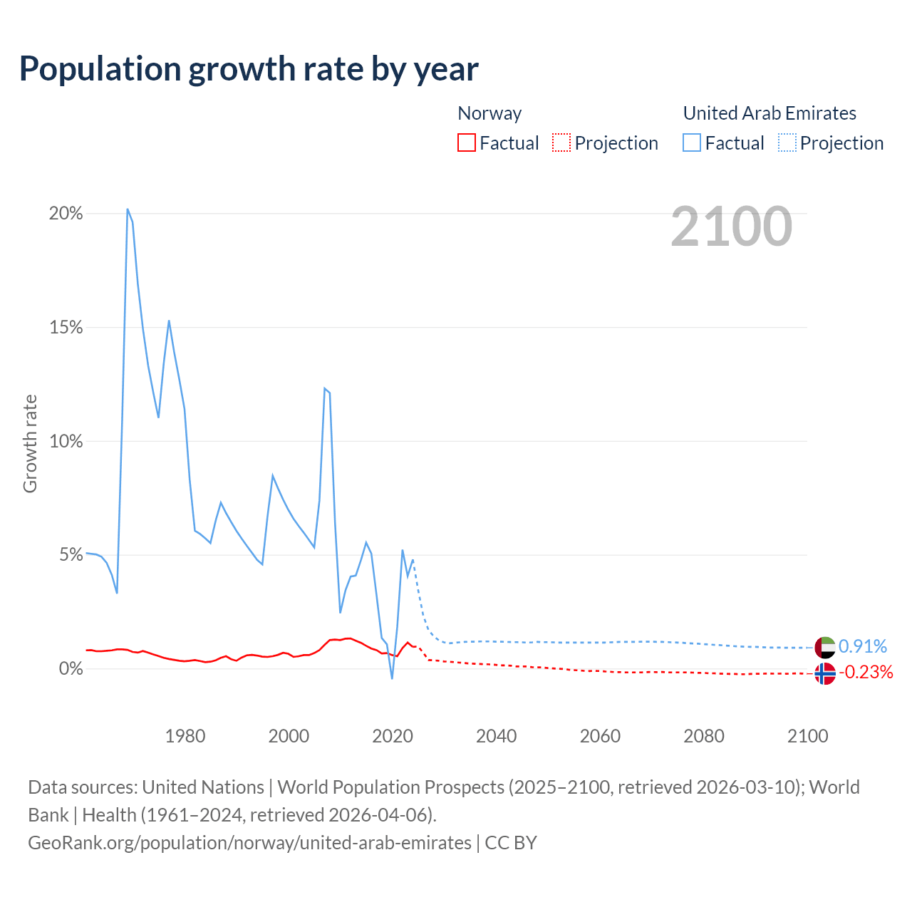 - For the last 10 years, Norway has had an average growth rate of +0.85% per year vs +3.31% in the United Arab Emirates.