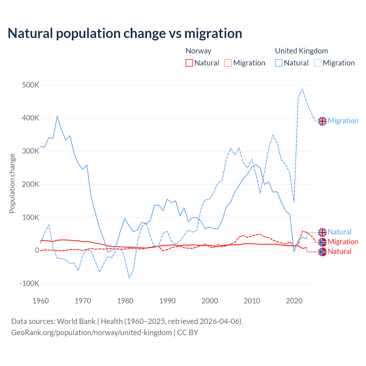 Over the last 10 years, 31.3% of the population change in Norway is from natural causes (a gain of 138,699 people) and 68.7% is from migration (a gain of 303,945 people). In the United Kingdom 23.9% is from natural causes (a gain of 1,033,129 people) and 76.1% is from migration (a gain of 3,283,101 people).