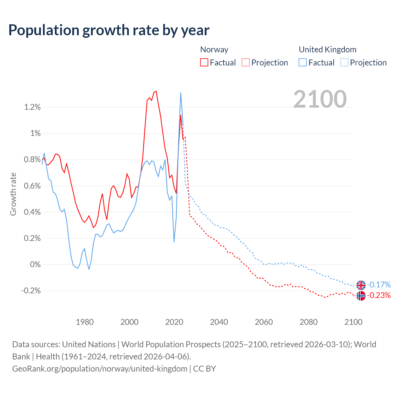 - For the last 10 years, Norway has had an average growth rate of +0.85% per year vs +0.7% in the United Kingdom.