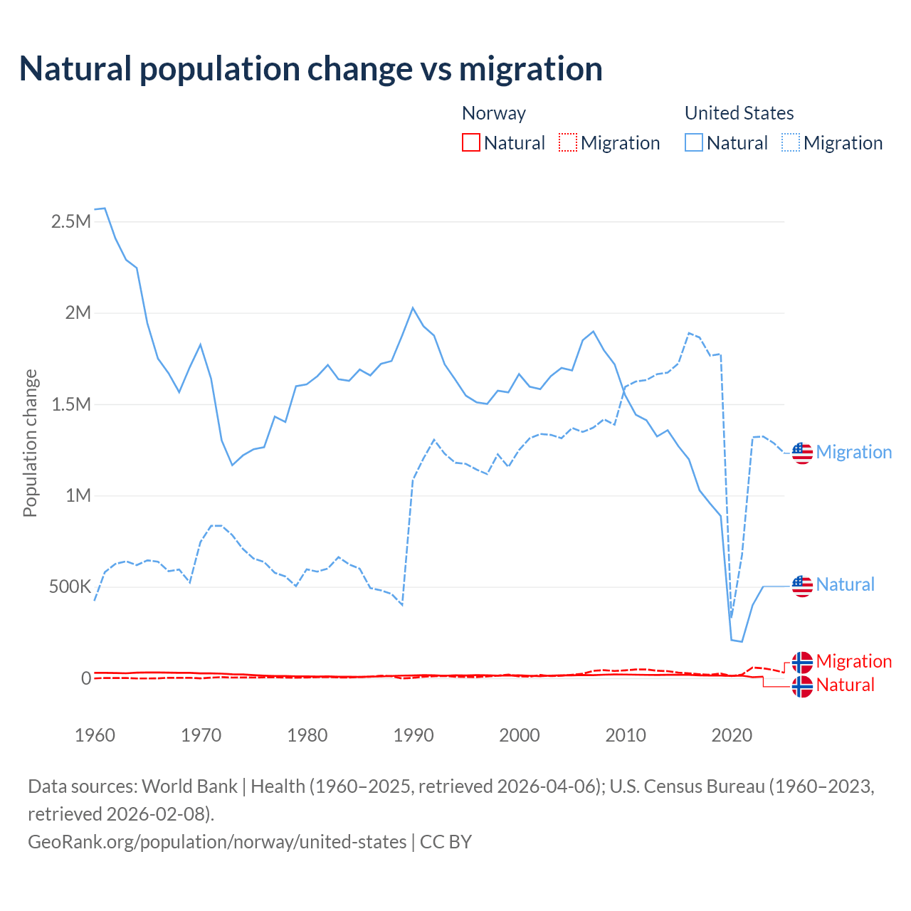 Over the last 10 years, 31.3% of the population change in Norway is from natural causes (a gain of 138,699 people) and 68.7% is from migration (a gain of 303,945 people). In the United States 35.8% is from natural causes (a gain of 8,005,866 people) and 64.2% is from migration (a gain of 14,334,286 people).