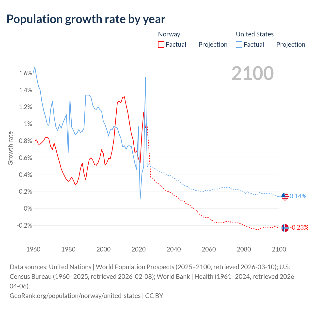 - For the last 10 years, Norway has had an average growth rate of +0.85% per year vs +0.65% in the United States.