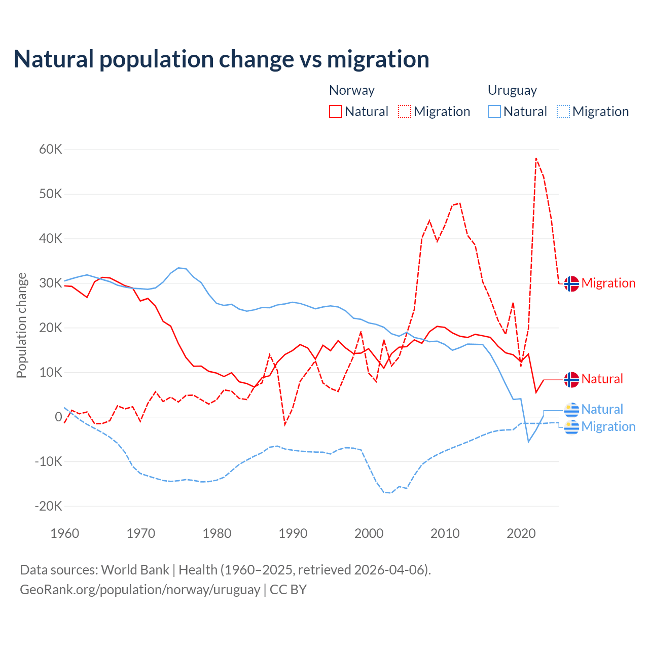 Over the last 10 years, 31.3% of the population change in Norway is from natural causes (a gain of 138,699 people) and 68.7% is from migration (a gain of 303,945 people). In Uruguay 70% is from natural causes (a gain of 64,303 people) and 30% is from migration (a loss of 27,501 people).