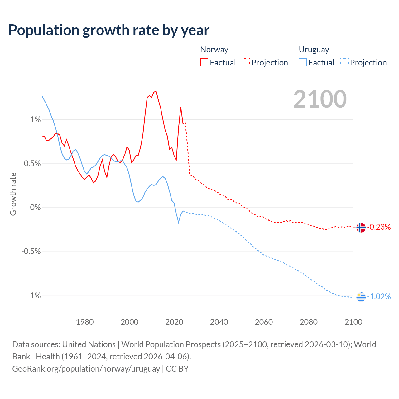 - For the last 10 years, Norway has had an average growth rate of +0.85% per year vs +0.11% in Uruguay.