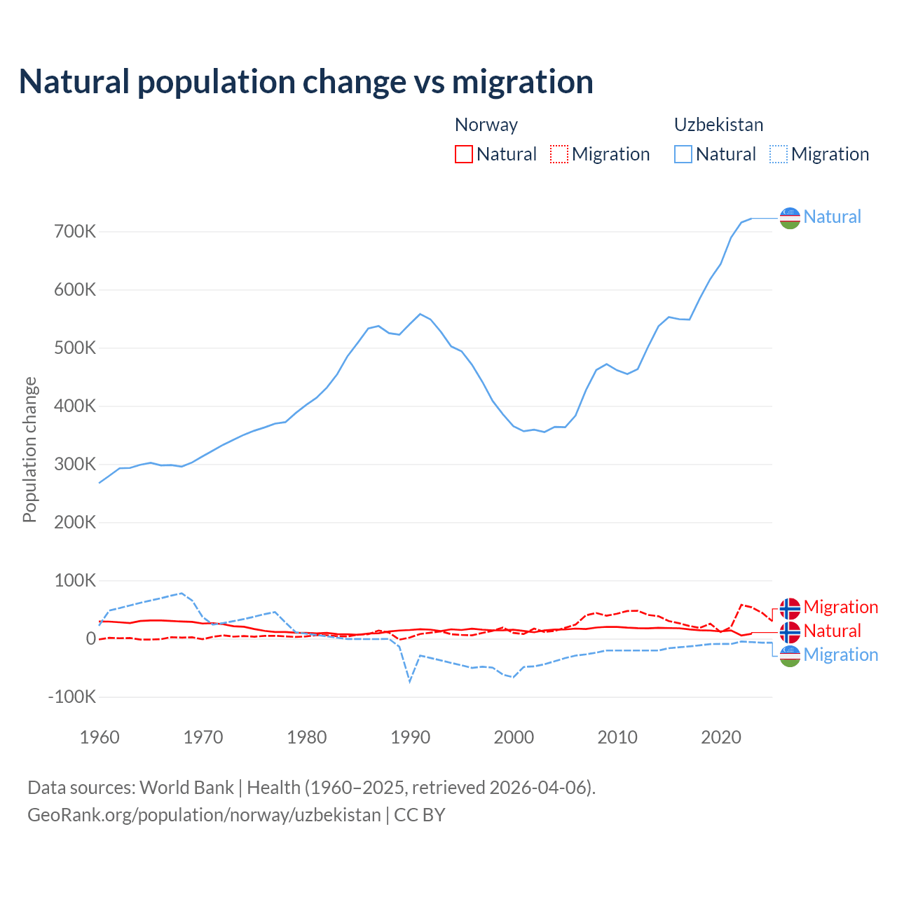 Over the last 10 years, 31.3% of the population change in Norway is from natural causes (a gain of 138,699 people) and 68.7% is from migration (a gain of 303,945 people). In Uzbekistan 98.2% is from natural causes (a gain of 6,161,117 people) and 1.84% is from migration (a loss of 115,398 people).
