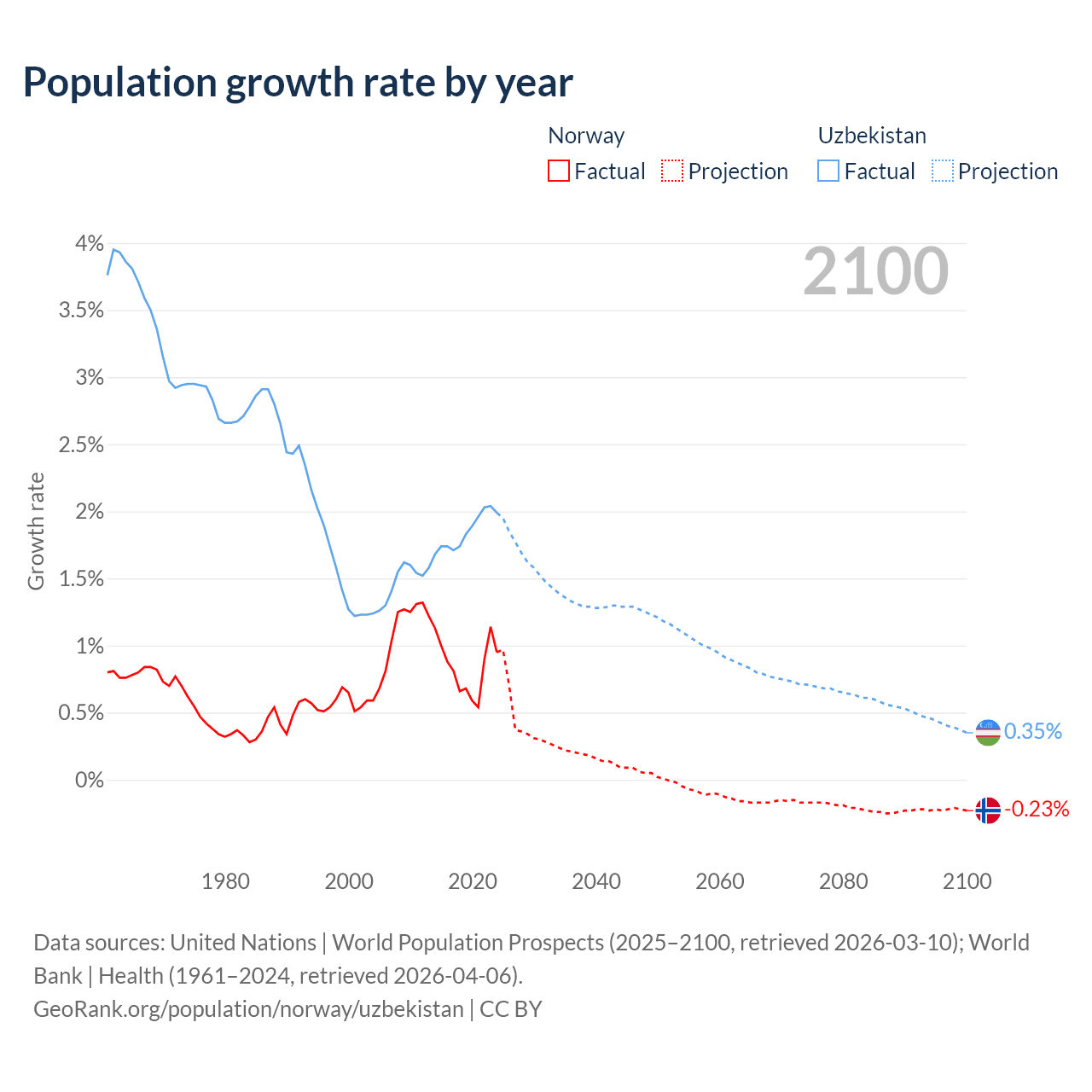 - For the last 10 years, Norway has had an average growth rate of +0.85% per year vs +1.85% in Uzbekistan.