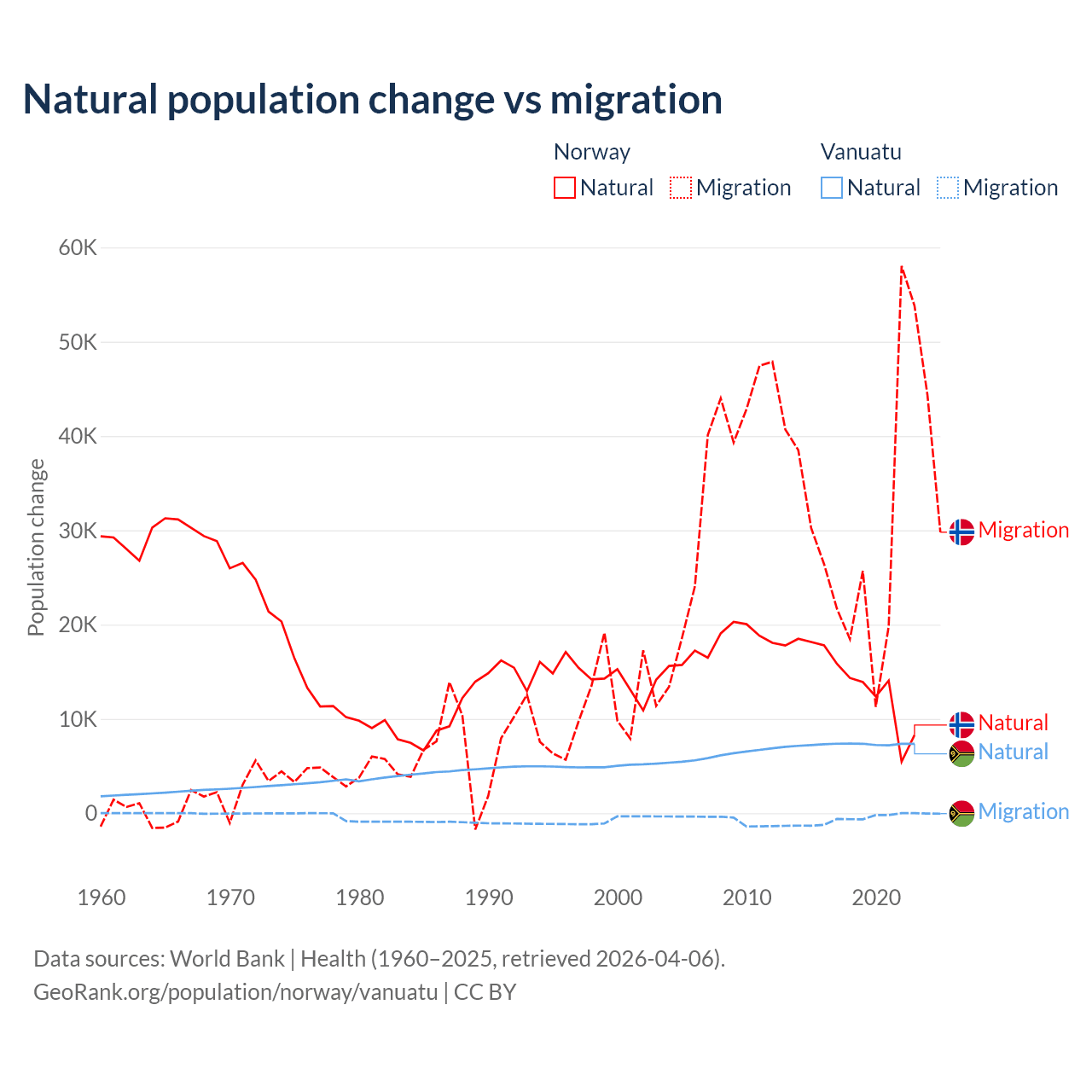 Over the last 10 years, 31.3% of the population change in Norway is from natural causes (a gain of 138,699 people) and 68.7% is from migration (a gain of 303,945 people). In Vanuatu 92.2% is from natural causes (a gain of 72,941 people) and 7.81% is from migration (a loss of 6,181 people).