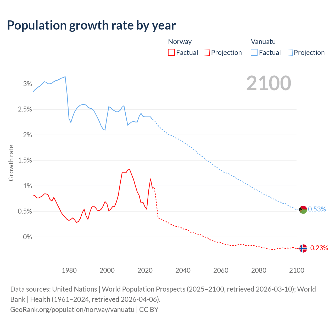 - For the last 10 years, Norway has had an average growth rate of +0.85% per year vs +2.33% in Vanuatu.