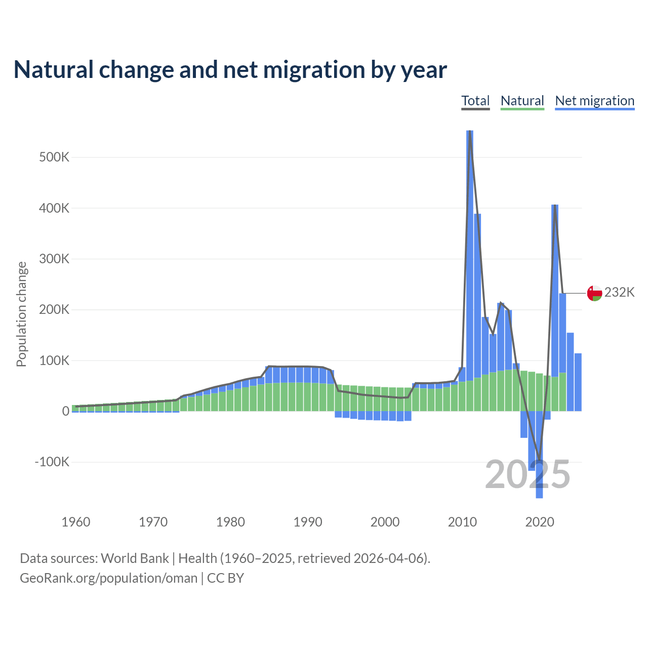 Over the last 10 years, 61.6% of the population change in Oman is from natural causes (a gain of 763,049 people) and 38.4% is from migration (a gain of 475,565 people).
