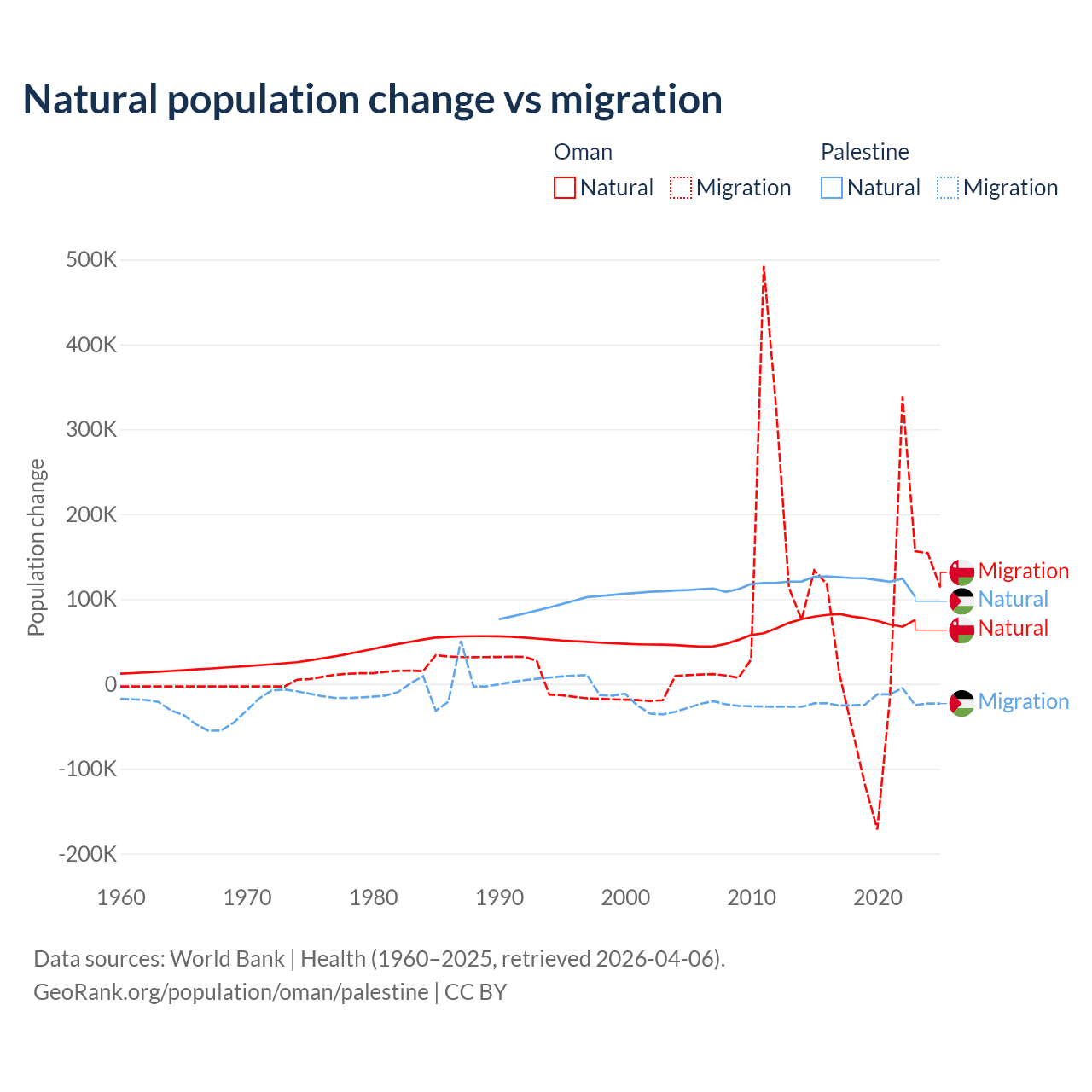 Over the last 10 years, 61.6% of the population change in Oman is from natural causes (a gain of 763,049 people) and 38.4% is from migration (a gain of 475,565 people). In Palestine 85.7% is from natural causes (a gain of 1,218,010 people) and 14.3% is from migration (a loss of 202,820 people).