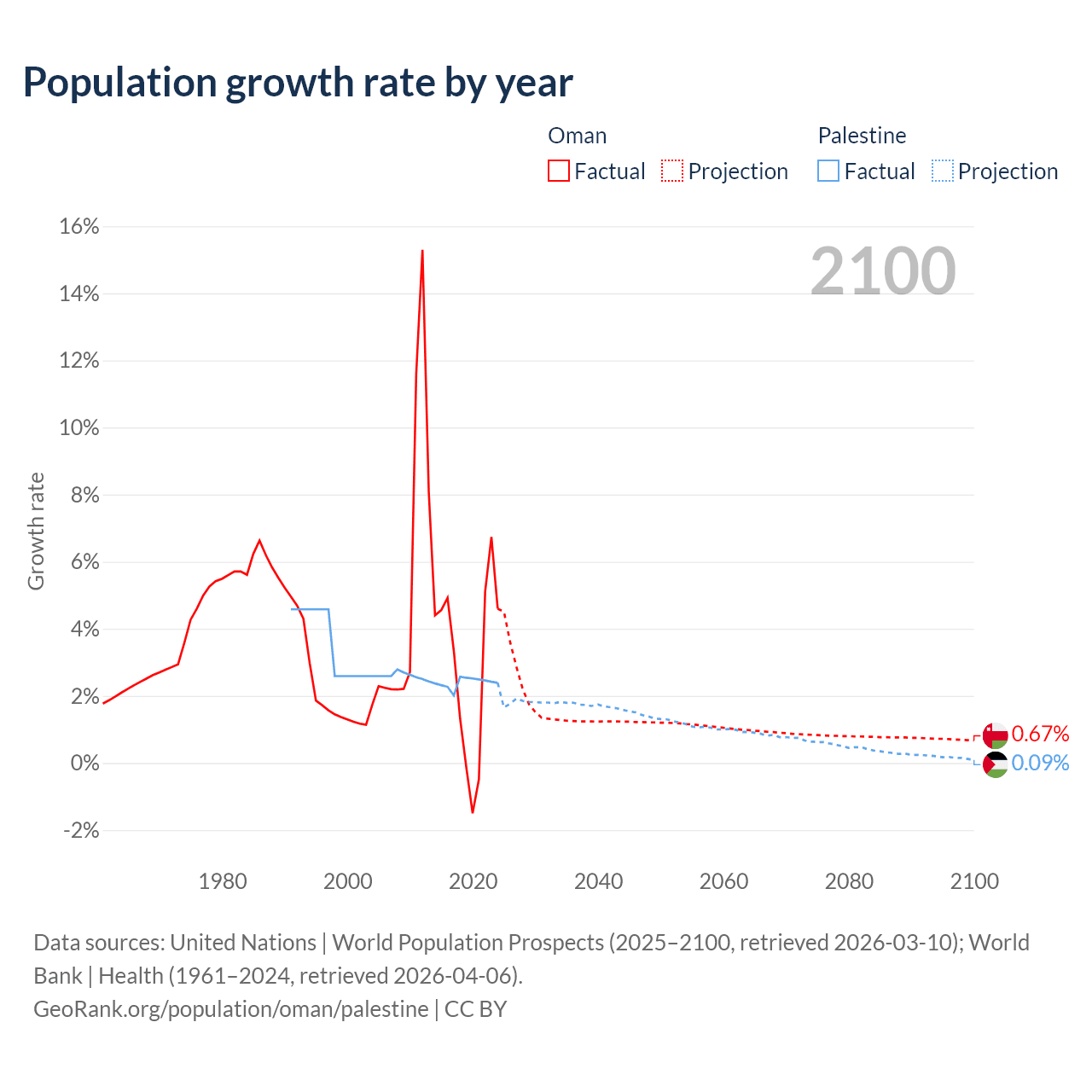- For the last 10 years, Oman has had an average growth rate of +2.99% per year vs +2.4% in Palestine.