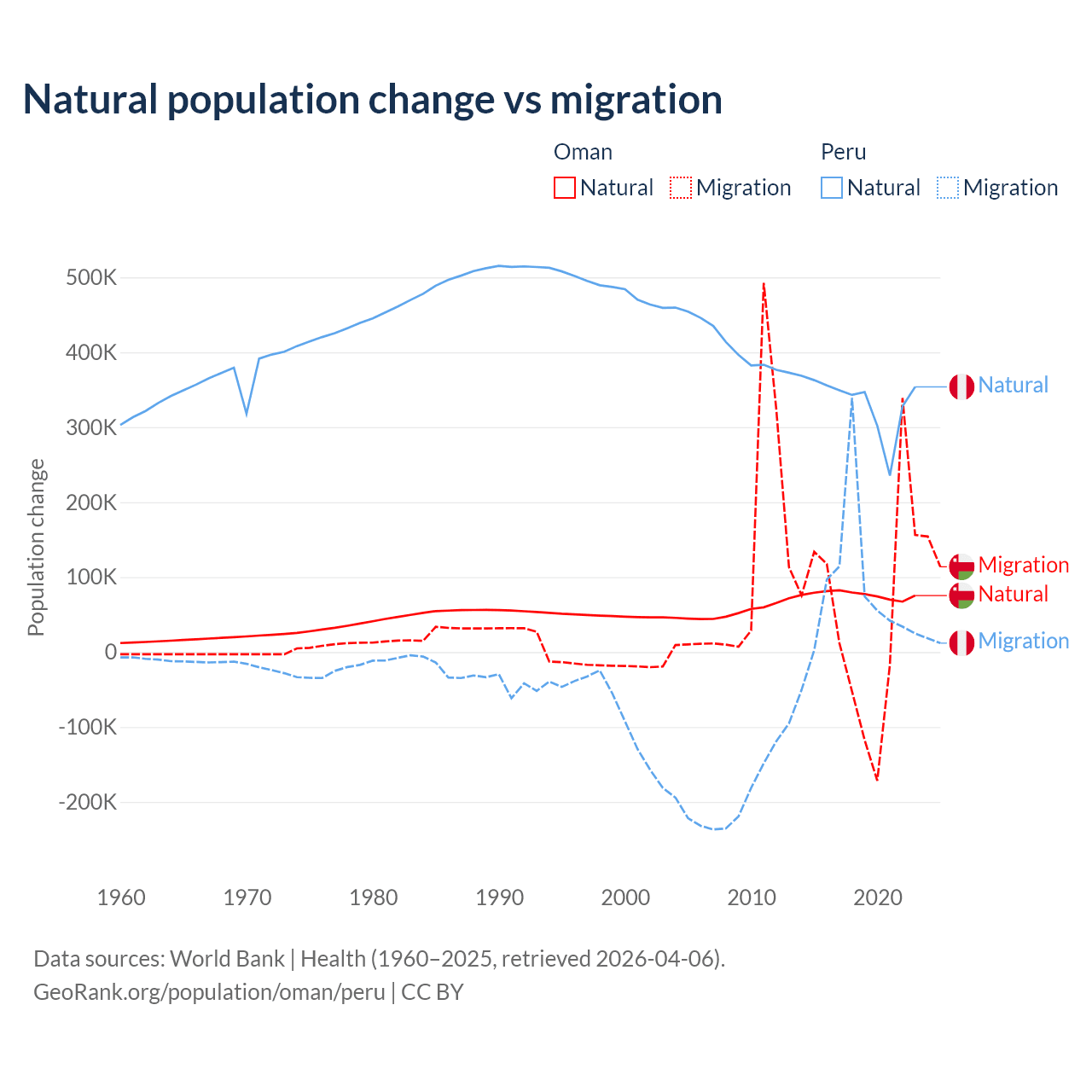 Over the last 10 years, 61.6% of the population change in Oman is from natural causes (a gain of 763,049 people) and 38.4% is from migration (a gain of 475,565 people). In Peru 82% is from natural causes (a gain of 3,345,822 people) and 18% is from migration (a gain of 732,505 people).