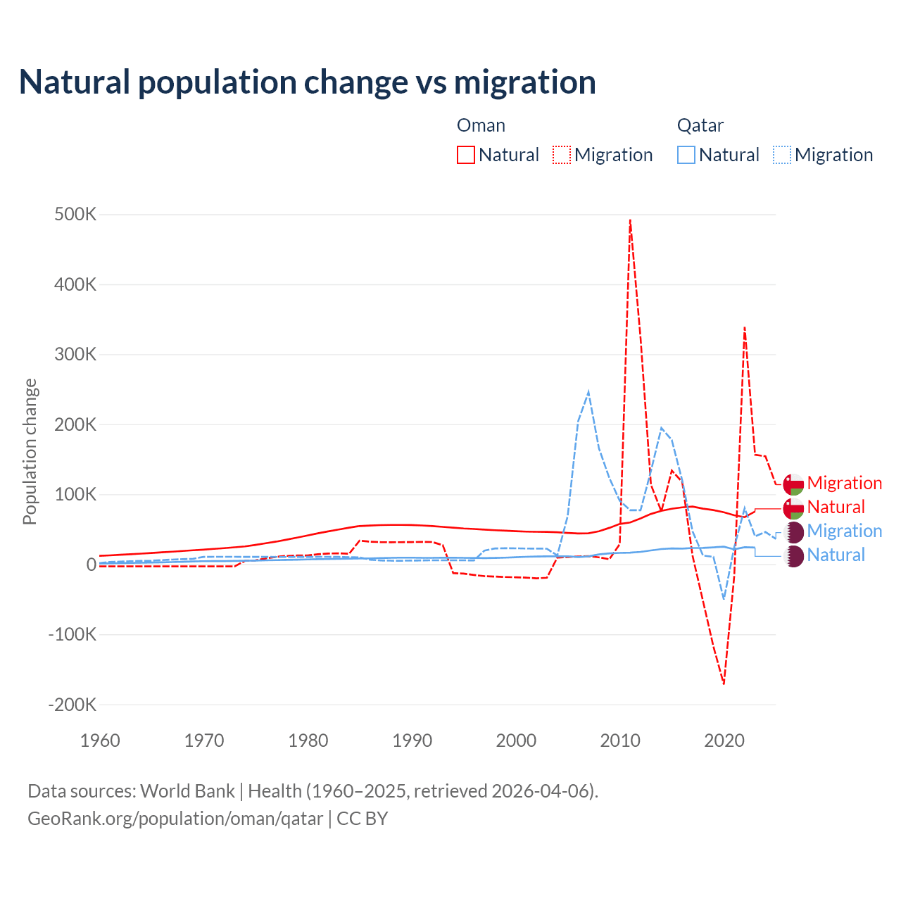 Over the last 10 years, 61.6% of the population change in Oman is from natural causes (a gain of 763,049 people) and 38.4% is from migration (a gain of 475,565 people). In Qatar 26.1% is from natural causes (a gain of 232,009 people) and 73.9% is from migration (a gain of 655,712 people).