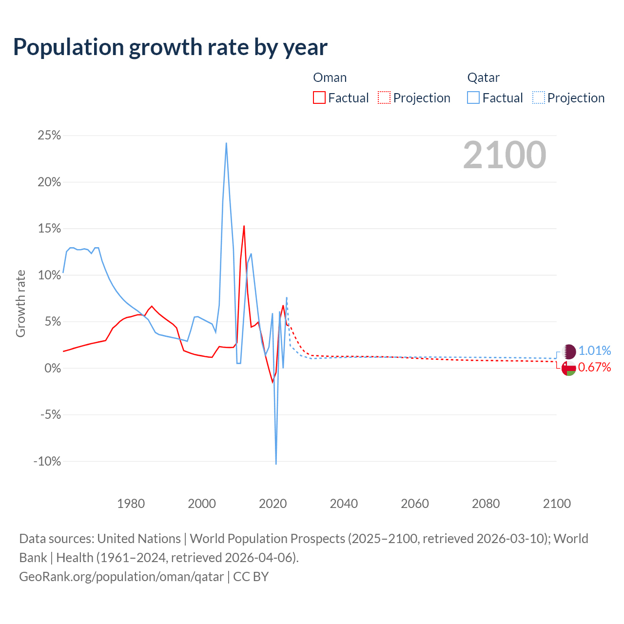 - For the last 10 years, Oman has had an average growth rate of +2.99% per year vs +3.86% in Qatar.