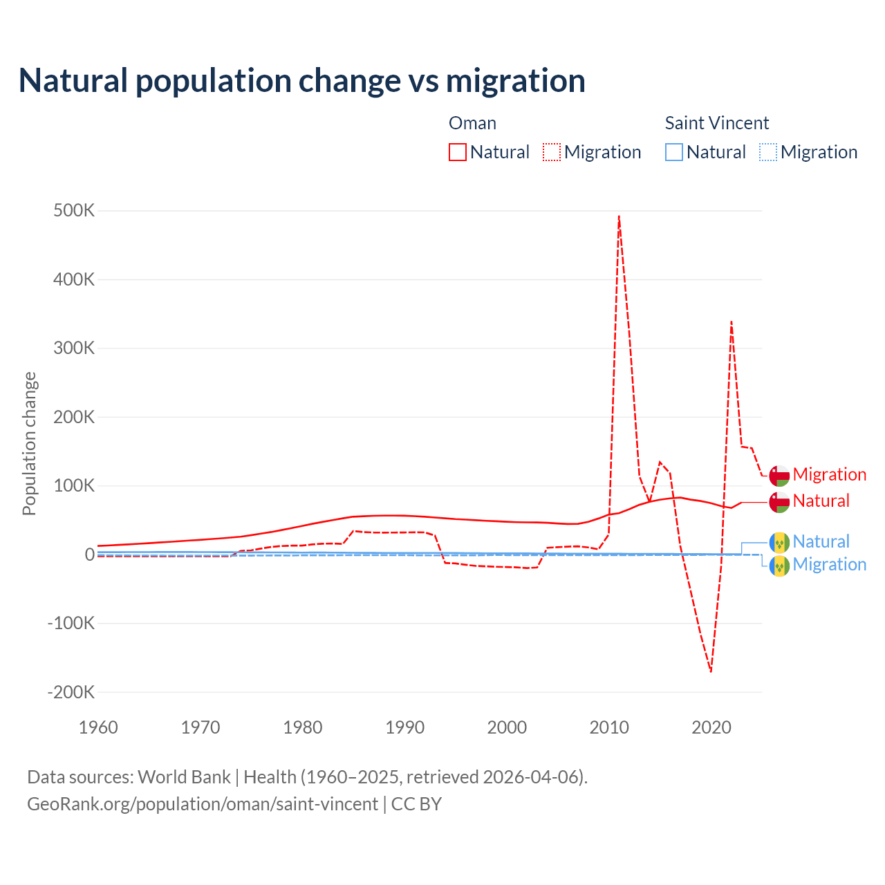 Over the last 10 years, 61.6% of the population change in Oman is from natural causes (a gain of 763,049 people) and 38.4% is from migration (a gain of 475,565 people). In Saint Vincent 21.2% is from natural causes (a gain of 2,525 people) and 78.8% is from migration (a loss of 9,393 people).