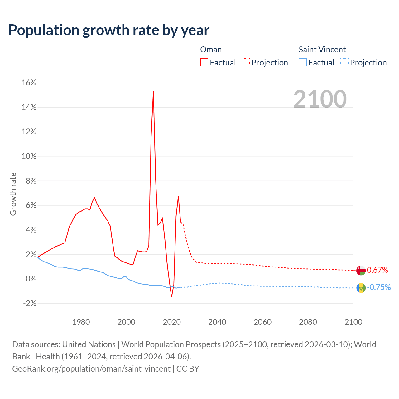 - For the last 10 years, Oman has had an average growth rate of +2.99% per year vs -0.65% in Saint Vincent.